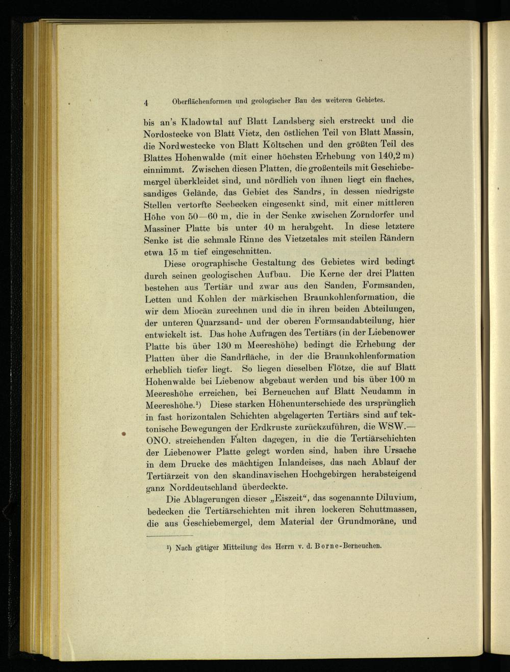 Diese orographische Gestaltung des Gebietes wird bedingt durch seinen geologischen Aufbau. Die Kerne der drei Platten bestehen aus Tertiär und zwar aus den Sanden, Formsanden, Letten und Kohlen der märkischen Braunkohlenformation, die wir dem Miocän zurechnen und die in ihren beiden Abteilungen, der unteren Quarzsand- und der oberen Formsandabteilung, hier entwickelt ist. Das hohe Aufragen des Tertiärs(in der Liebenower Platte bis über 130 m Meereshöhe) bedingt die Erhebung der Platten über die Sandrfläche, in der die Braunkohlenformation erheblich tiefer liegt. So liegen dieselben Flötze, die auf Blatt Hohenwalde bei Liebenow abgebaut werden und bis über 100 m Meereshöhe erreichen, bei Berneuchen auf Blatt Neudamm in Meereshöhe.!) Diese starken Höhenunterschiede des ursprünglich in fast horizontalen Schichten abgelagerten Tertiärs sind auf tektonische Bewegungen der Erdkruste zurückzuführen, die WSW.— ONO. streichenden Falten dagegen, in die die Tertiärschichten der Liebenower Platte gelegt worden sind, haben ihre Ursache in dem Drucke des mächtigen Inlandeises, das nach Ablauf der Tertiärzeit von den skandinavischen Hochgebirgen herabsteigend ganz Norddeutschland überdeckte.