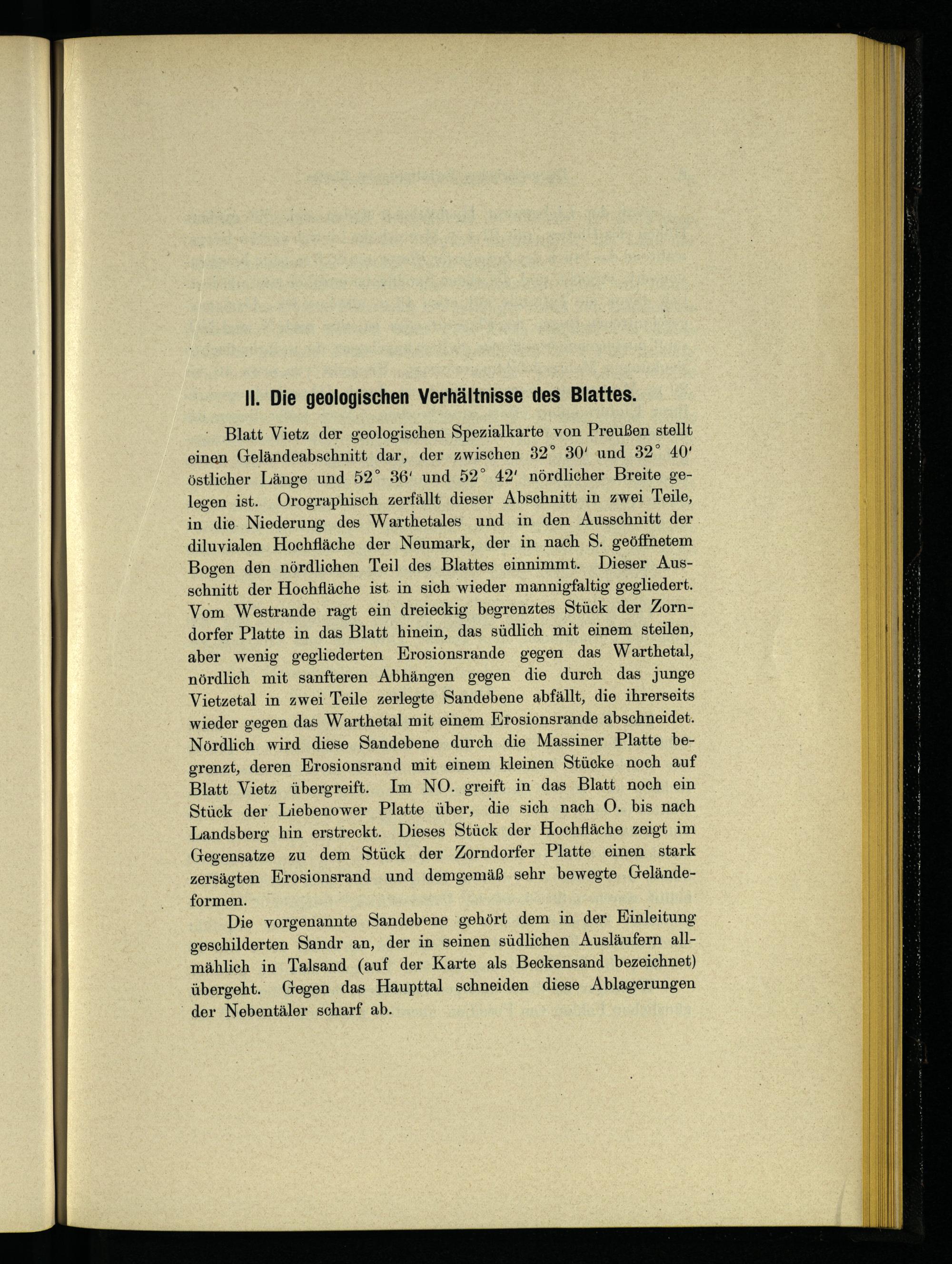 Blatt Vietz der geologischen. Spezialkarte von Preußen stellt einen Geländeabschnitt dar, der zwischen 32° 30‘ und 32° 40’ östlicher Länge und 52° 36‘ und 52° 42‘ nördlicher Breite gelegen ist. Orographisch zerfällt dieser Abschnitt in zwei Teile, in die. Niederung des Warthetales und in den Ausschnitt der diluvialen Hochfläche der Neumark , der in nach S. geöffnetem Bogen den nördlichen Teil des Blattes einnimmt. Dieser Ausschnitt der Hochfläche ist. in sich wieder mannigfaltig gegliedert. Vom Westrande ragt ein dreieckig begrenztes Stück der Zorndorfer Platte in das Blatt hinein, das südlich mit einem steilen, aber wenig gegliederten Erosionsrande gegen das Warthetal, nördlich mit sanfteren Abhängen gegen die durch das junge Vietzetal in zwei Teile zerlegte Sandebene abfällt, die ihrerseits wieder gegen das Warthetal mit einem Erosionsrande abschneidet. Nördlich wird diese Sandebene durch die Massiner Platte begrenzt, deren Erosionsrand mit einem kleinen Stücke noch auf Blatt Vietz übergreift. Im NO. greift in das Blatt noch ein Stück der Liebenower Platte über, die sich nach O. bis nach Landsberg hin erstreckt. Dieses Stück der Hochfläche zeigt im Gegensatze zu dem Stück der Zorndorfer Platte einen stark zersägten Erosionsrand und demgemäß sehr bewegte Geländeformen.