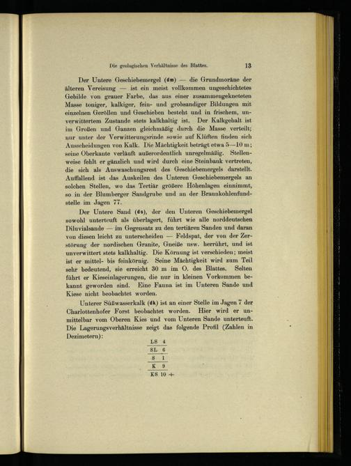 Der Untere Geschiebemergel(dm)— die Grundmoräne der älteren Vereisung— ist ein meist vollkommen ungeschichtetes Gebilde von grauer Farbe, das aus einer zusammengekneteten Masse toniger, kalkiger, fein- und grobsandiger Bildungen mit einzelnen Geröllen und Geschieben besteht und in frischem, unverwittertem Zustande stets kalkhaltig ist. Der Kalkgehalt ist im Großen und Ganzen gleichmäßig durch die Masse verteilt; nur unter der Verwitterungsrinde sowie auf Klüften finden sich Ausscheidungen von Kalk. Die Mächtigkeit beträgt etwa 5—10 m; seine Oberkante verläuft außerordentlich unregelmäßig. Stellenweise fehlt er gänzlich und wird durch eine Steinbank vertreten, die sich als Auswaschungsrest des Geschiebemergels darstellt. Auffallend ist das Auskeilen des Unteren Geschiebemergels an solchen Stellen, wo das Tertiär größere Höhenlagen einnimmt, so in der Blumberger Sandgrube und an der Braunkohlenfundstelle im Jagen 77.