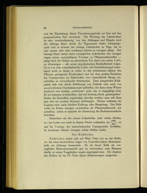 Kalkboden findet sich auf Blatt Vietz-nur an der Stelle, wo das oben beschriebene Lager von Unterdiluvialem Süßwasserkalk am Abhange heraustritt. Es ist dieser Kalk als vorzügliches Meliorationsmittel gut zu verwenden; zum Brennen dürfte er seines Tongehaltes wegen ungeeignet sein. Die Analyse des Kalkes ist im IV. Teile dieser Erläuterungen mitgeteilt.