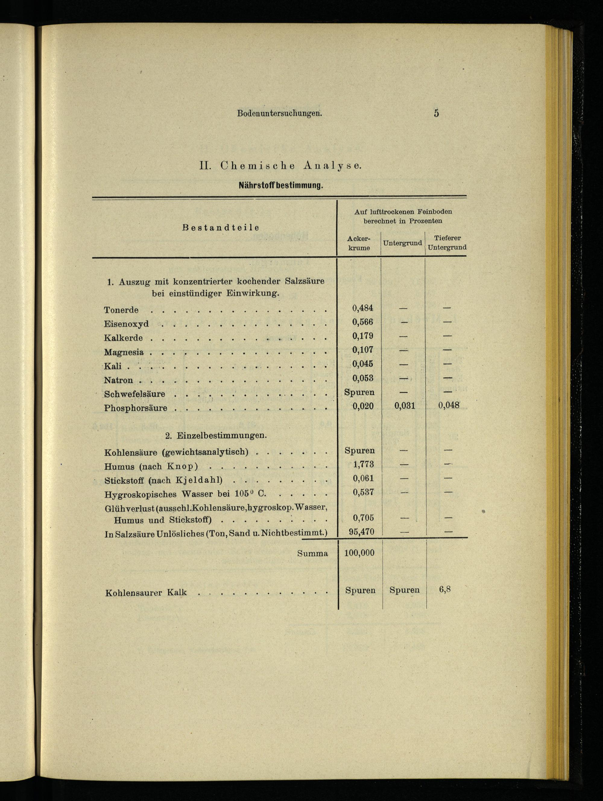 Kohlensäure(gewichtsanalytisch)....++ Spuren Humus(nach Knop) 4 1,778 Stickstoff(nach Kjeldahl). 2 4. 044 0,061 Hygroskopisches Wasser bei 105° C.....- 0,537