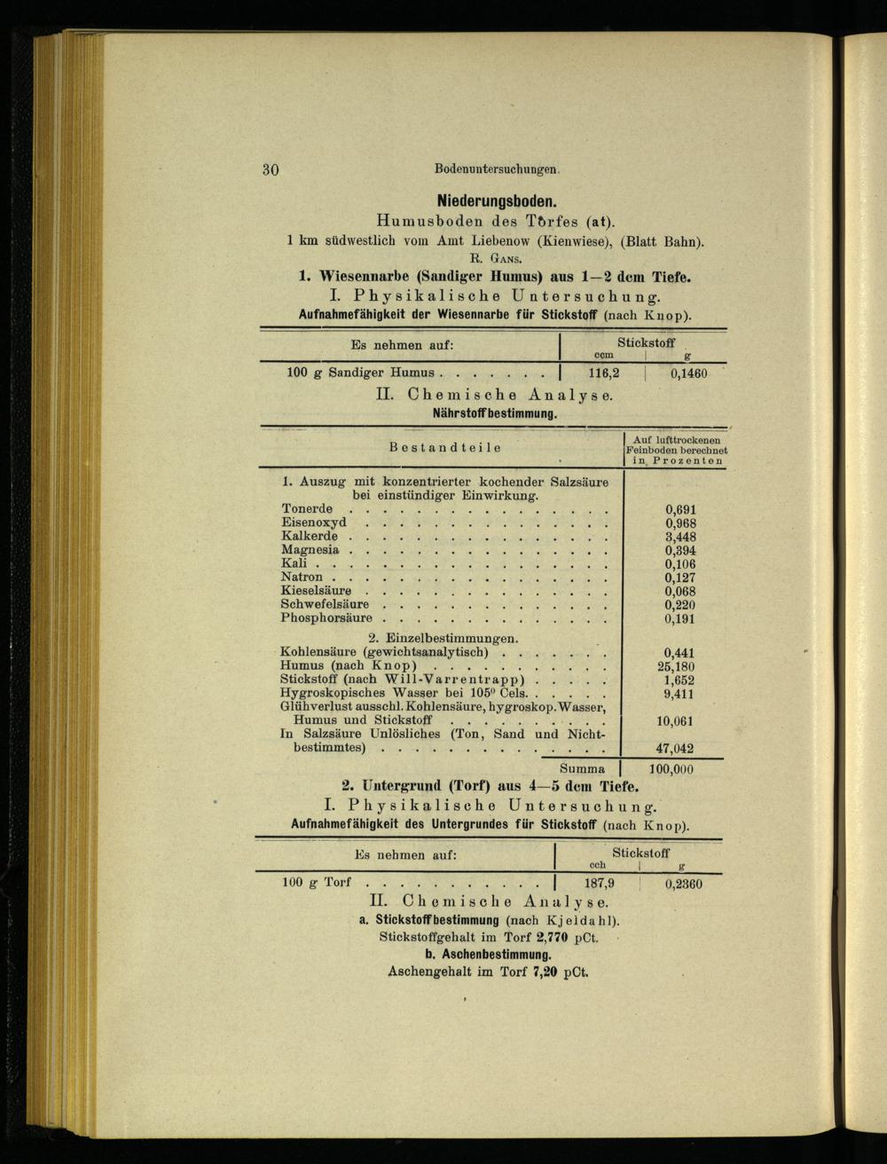 Niederungsboden. Humusboden des Törfes(at). 1 km südwestlich vom Amt Liebenow(Kienwiese),(Blatt Bahn). R. Gans, 1. Wiesennarbe(Sandiger Humus) aus 1—2 dem Tiefe. I. Physikalische Untersuchung. Aufnahmefähigkeit der Wiesennarbe für Stickstoff(nach Knop).