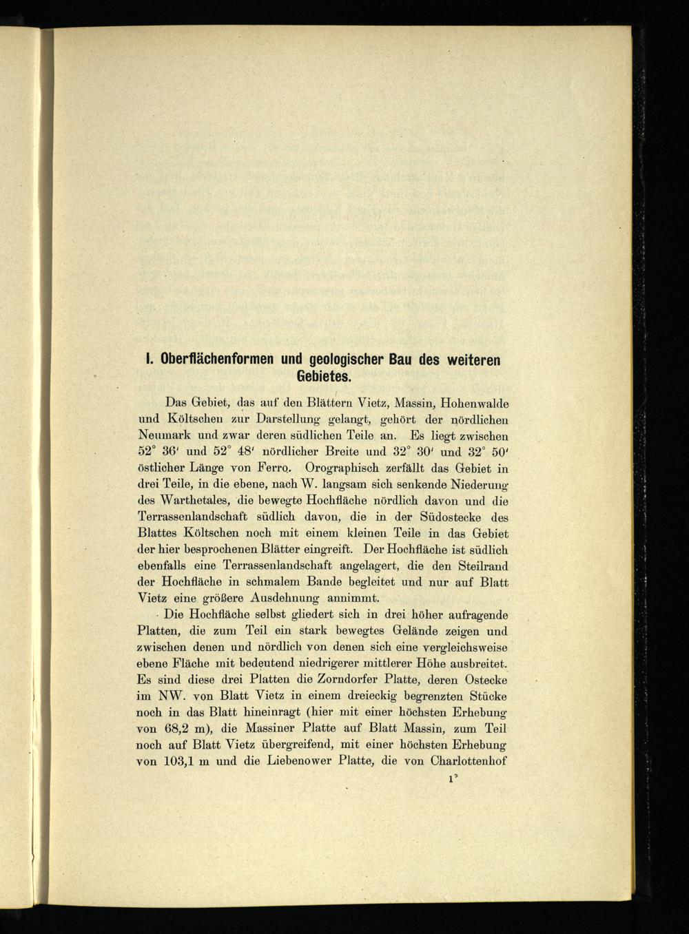 Das Gebiet, das auf den Blättern Vietz, Massin, Hohenwalde und Költschen zur Darstellung gelangt, gehört der nördlichen Neumark und zwar deren südlichen Teile an. Es liegt zwischen 52° 36‘ und 52° 48‘ nördlicher Breite und 32° 30‘ und 32° 50‘ östlicher Länge von Ferro. Orographisch zerfällt das Gebiet in drei Teile, in die ebene, nach W. langsam sich senkende Niederung des Warthetales, die bewegte Hochfläche nördlich davon und die Terrassenlandschaft südlich davon, die in der Südostecke des Blattes Költschen noch mit einem kleinen Teile in das Gebiet der hier besprochenen Blätter eingreift. Der Hochfläche ist südlich ebenfalls eine Terrassenlandschaft angelagert, die den Steilrand der Hochfläche in schmalem Bande begleitet und nur auf Blatt Vietz eine größere Ausdehnung annimmt.