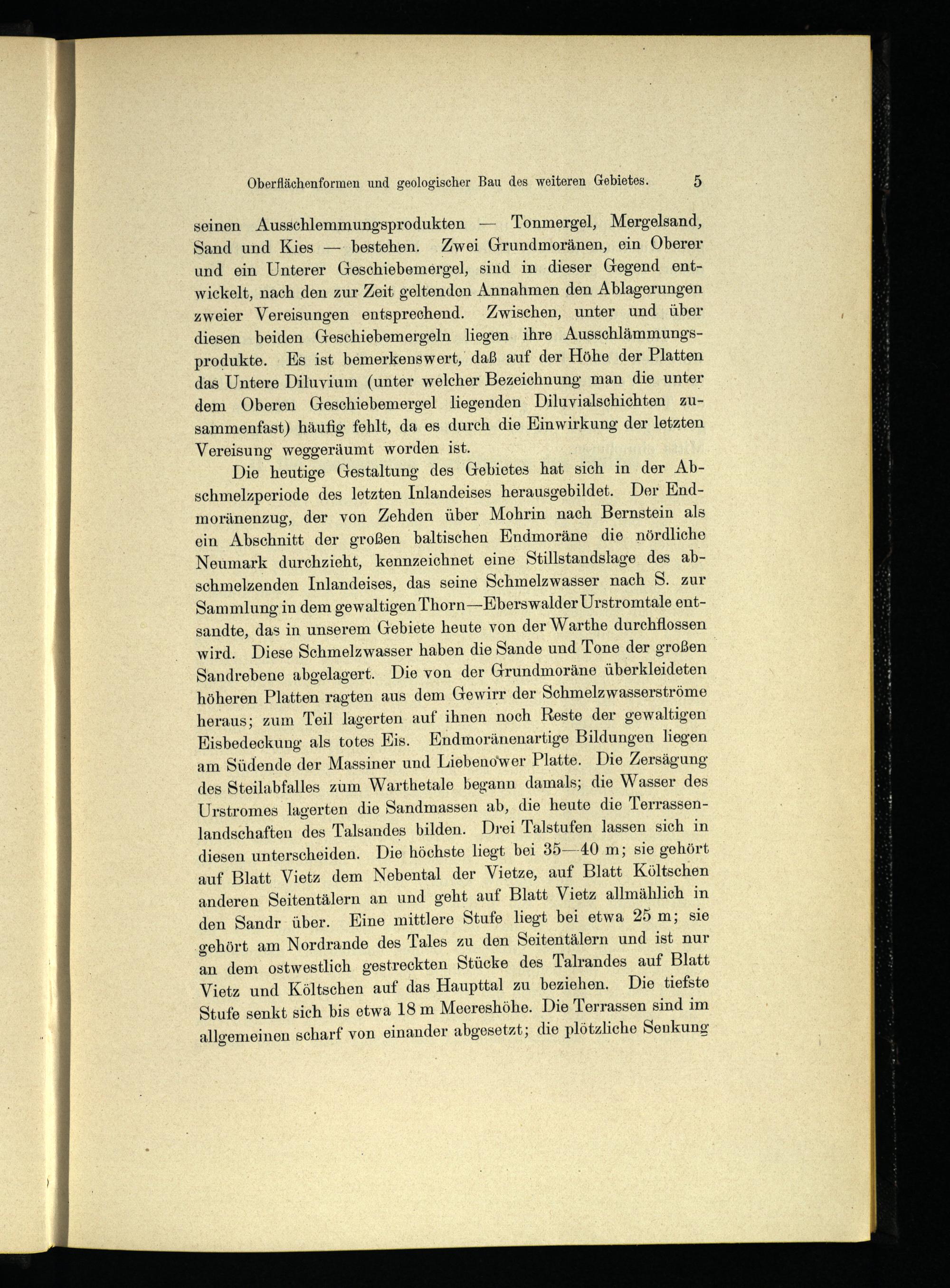 Die heutige Gestaltung des Gebietes hat sich in der Abschmelzperiode des letzten Inlandeises herausgebildet. Der Endmoränenzug, der von Zehden über Mohrin nach Bernstein als ein Abschnitt der großen baltischen Endmoräne die nördliche Neumark durchzieht, kennzeichnet eine Stillstandslage des abschmelzenden Inlandeises, das seine Schmelzwasser nach S. zur Sammlung in dem gewaltigen Thorn—Eberswalder Urstromtale entsandte, das in unserem Gebiete heute von der Warthe durchflossen wird. Diese Schmelzwasser haben die Sande und Tone der großen Sandrebene abgelagert. Die von der Grundmoräne überkleideten höheren Platten ragten aus dem Gewirr der Schmelzwasserströme heraus; zum Teil lagerten auf ihnen noch Reste der gewaltigen Eisbedeckung als totes Kis. Endmoränenartige Bildungen liegen am Südende der Massiner und Liebenower Platte. Die Zersägung des Steilabfalles zum Warthetale begann damals; die Wasser des Urstromes lagerten die Sandmassen ab, die heute die Terrassenlandschaften des Talsandes bilden. Drei Talstufen lassen sich in diesen unterscheiden. Die höchste liegt bei 35—-40 m; sie gehört auf Blatt Vietz dem Nebental der Vietze, auf Blatt Költschen anderen Seitentälern an und geht auf Blatt Vietz allmählich in den Sandr- über. Eine mittlere Stufe liegt bei etwa 25 m; sie gehört am Nordrande des Tales zu den Seitentälern und ist nur an dem ostwestlich gestreckten Stücke des Talrandes auf Blatt Vietz und Költschen auf das Haupttal zu beziehen. Die tiefste Stufe senkt sich bis etwa 18 m Meereshöhe. Die Terrassen sind im allgemeinen scharf von einander abgesetzt; die plötzliche Senkung