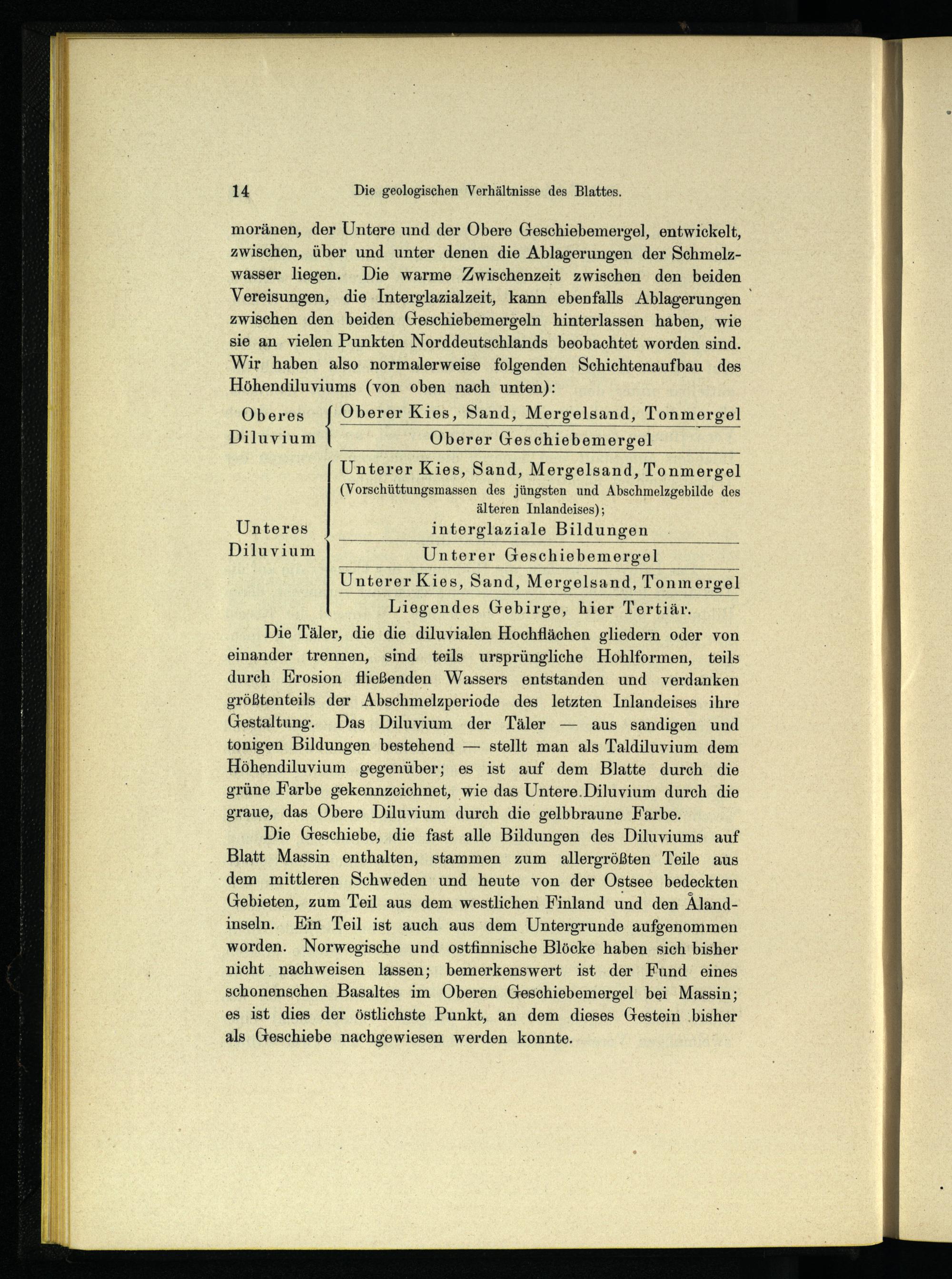 moränen , der Untere und der Obere Geschiebemergel, entwickelt, zwischen, über und unter denen die Ablagerungen der Schmelzwasser liegen. Die warme Zwischenzeit zwischen den beiden Vereisungen, die Interglazialzeit, kann ebenfalls Ablagerungen zwischen den beiden Geschiebemergeln hinterlassen haben, wie sie an vielen Punkten Norddeutschlands beobachtet worden sind. Wir haben also normalerweise folgenden Schichtenaufbau des Höhendiluviums(von oben nach unten):