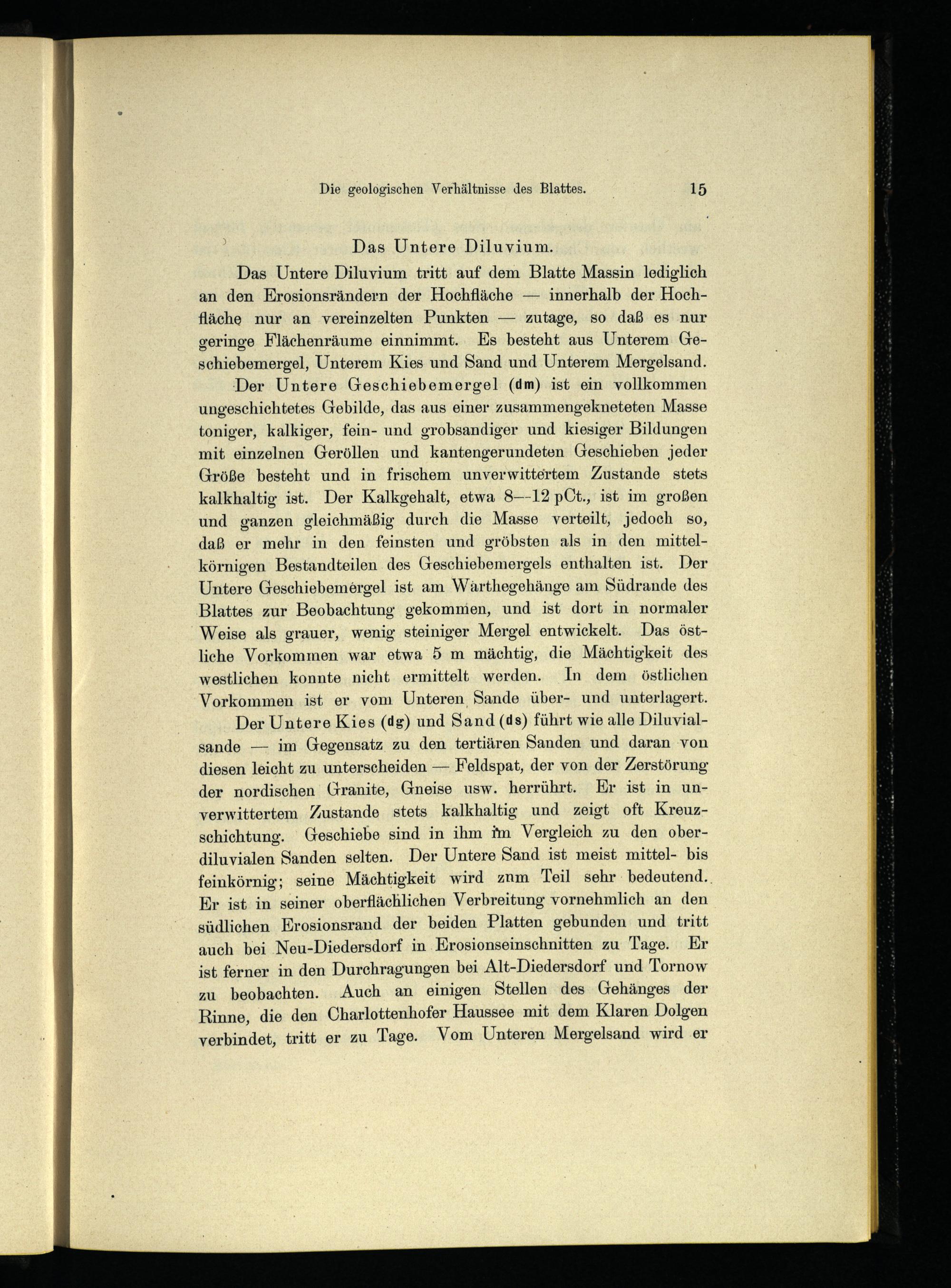 Das Untere Diluvium tritt auf dem Blatte Massin lediglich an den Erosionsrändern der Hochfläche— innerhalb der Hochfläche nur an vereinzelten Punkten— zutage, so daß es nur geringe Flächenräume einnimmt. Es besteht aus Unterem Geschiebemergel, Unterem Kies und Sand und Unterem Mergelsand.
