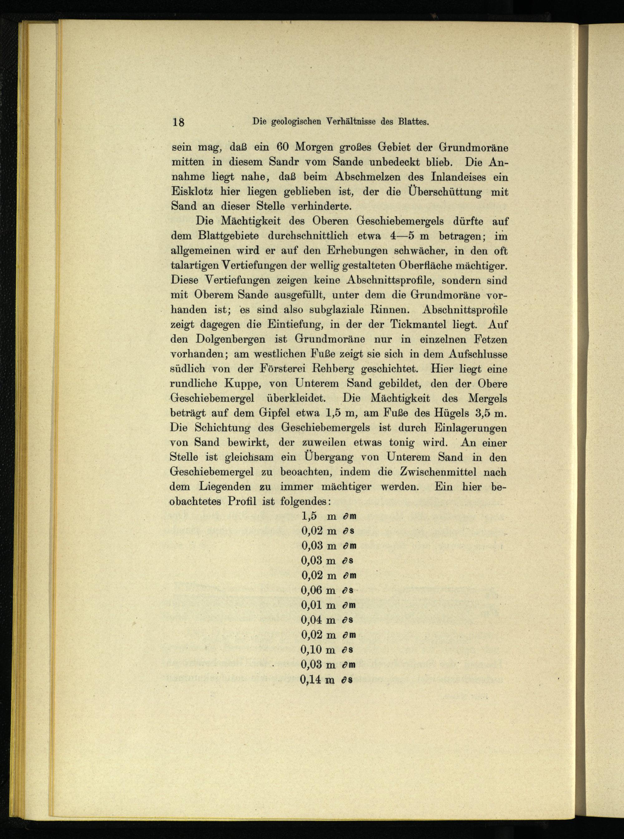 Die Mächtigkeit des Oberen Geschiebemergels dürfte auf dem Blattgebiete durchschnittlich etwa 4—5 m betragen; im allgemeinen wird er auf den Erhebungen schwächer, in den oft talartigen Vertiefungen der wellig gestalteten Oberfläche mächtiger. Diese Vertiefungen zeigen keine Abschnittsprofile, sondern sind mit Oberem Sande ausgefüllt, unter dem die Grundmoräne vorhanden ist; es sind also subglaziale Rinnen. Abschnittsprofile zeigt dagegen die Eintiefung, in der der Tickmantel liegt. Auf den Dolgenbergen ist Grundmoräne nur in einzelnen Fetzen vorhanden; am westlichen Fuße zeigt sie sich in dem Aufschlusse südlich von der Försterei Rehberg geschichtet. Hier liegt eine rundliche Kuppe, von Unterem Sand gebildet, den der. Obere Geschiebemergel überkleidet. Die Mächtigkeit des Mergels beträgt auf dem Gipfel etwa 1,5 m, am Fuße des Hügels 3,5 m. Die Schichtung des Geschiebemergels ist durch Kinlagerungen von Sand bewirkt, der zuweilen etwas tonig wird. An einer Stelle ist gleichsam ein Übergang von Unterem Sand in den Geschiebemergel zu beoachten, indem die Zwischenmittel nach dem Liegenden zu immer mächtiger werden. Kin hier beobachtetes Profil ist folgendes: