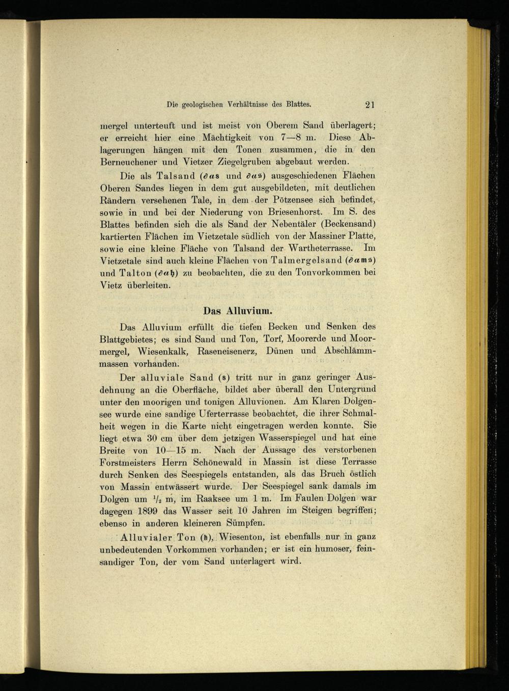 Der alluviale Sand(s) tritt nur in ganz geringer Ausdehnung an die Oberfläche, bildet aber überall den Untergrund unter den moorigen und tonigen Alluvionen. Am Klaren Dolgensee wurde eine sandige Uferterrasse beobachtet, die ihrer Schmalheit wegen in die Karte nicht eingetragen werden konnte. Sie liegt etwa 30 cm über dem jetzigen Wasserspiegel und hat eine Breite von 10—15 m. Nach der Aussage des verstorbenen Forstmeisters Herrn Schönewald in Massin ist diese Terrasse durch Senken des Seespiegels entstanden, als das Bruch östlich von Massin entwässert wurde. Der Seespiegel sank damals im Dolgen um!/» m, im Raaksee um 1m. Im Faulen Dolgen’ wär dagegen 1899 das Wasser seit 10 Jahren im Steigen begriffen; ebenso in anderen kleineren Sümpfen. |