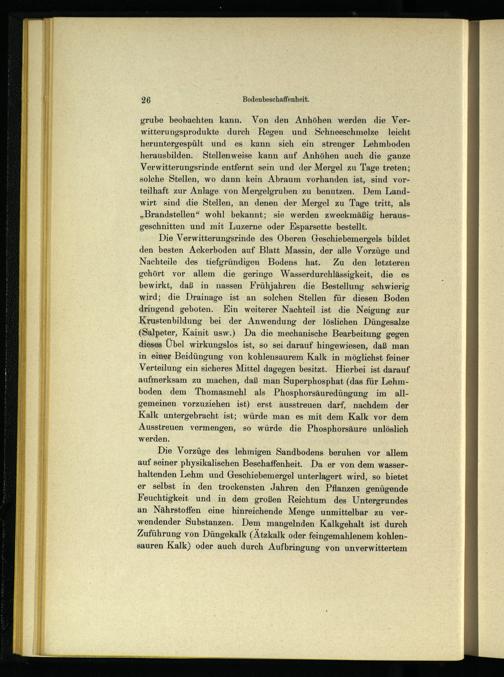 grube beobachten kann. Von den Anhöhen werden die Verwitterungsprodukte durch Regen und. Schneeschmelze leicht heruntergespült und es kann sich ein strenger Lehmboden herausbilden. Stellenweise kann auf Anhöhen auch die ganze Verwitterungsrinde entfernt sein und der Mergel zu Tage treten; solche Stellen, wo dann kein Abraum vorhanden ist, sind vorteilhaft zur Anlage von Mergelgruben zu benutzen. Dem Landwirt sind die Stellen, an denen der Mergel zu Tage tritt, als „Brandstellen“ wohl bekannt; sie werden zweckmäßig herausgeschnitten und mit Luzerne oder Esparsette bestellt.