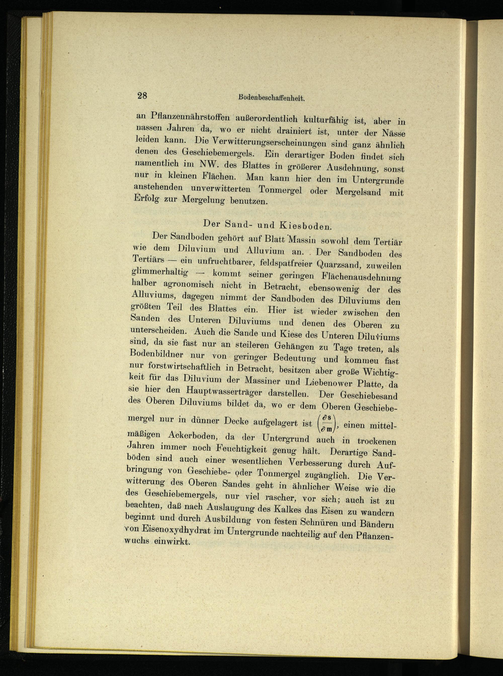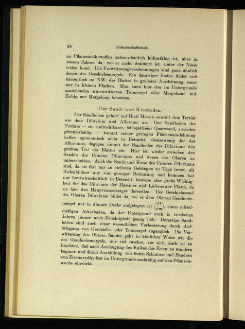 mäßigen Ackerboden, da der Untergrund auch in trockenen Jahren immer noch Feuchtigkeit genug hält. Derartige Sandböden sind auch einer wesentlichen Verbesserung durch Aufbringung von Geschiebe- oder Tonmergel zugänglich. Die Verwitterung des Oberen Sandes geht in ähnlicher Weise wie die des Geschiebemergels, nur viel rascher, vor sich; auch ist zu beachten, daß nach Auslaugung des Kalkes das Eisen zu wandern beginnt und durch Ausbildung von festen Schnüren und Bändern von Kisenoxydhydrat im Untergrunde nachteilig auf den Pflanzenwuchs einwirkt.