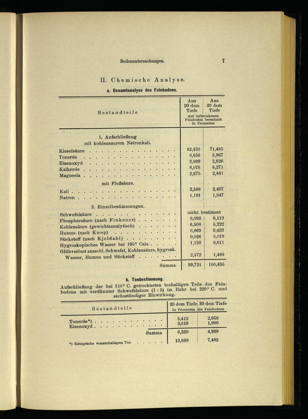 Aufschließung der bei 110° C. getrockneten tonhaltigen Teile des Feinbodens mit verdünnter Schwefelsäure(1: 5) im Rohr bei 220° C. und sechsstündiger Einwirkung.