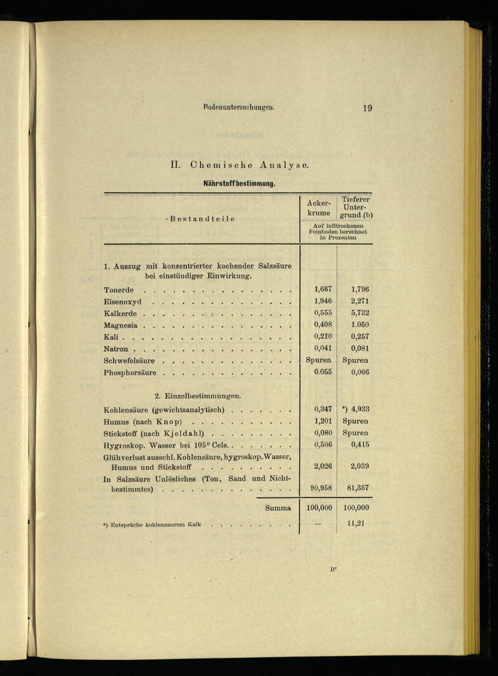 Kohlensäure(gewichtsanalytisch)......+|*) 4,933 Humus(nach Knop) 2.00. 0/ Spuren Stickstoff(nach Kjeldahl).. 0000 Spuren Hygroskop. Wasser bei 105° Cels.......- 0,415