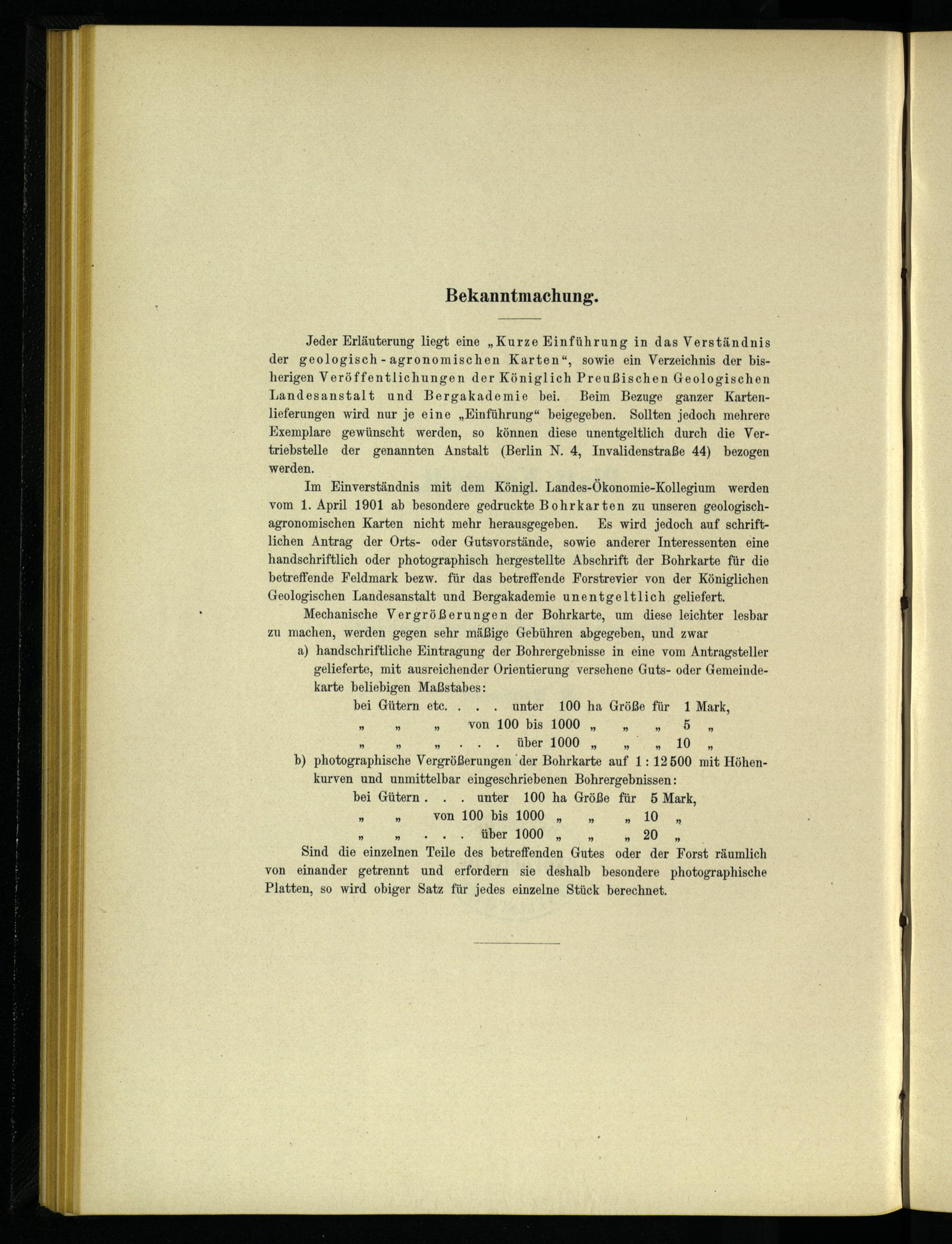 Im Einverständnis mit dem Königl. Landes-Ökonomie-Kollegium werden vom 1. April 1901 ab besondere gedruckte Bohrkarten zu unseren geologischagronomischen Karten nicht mehr herausgegeben. Es wird jedoch auf schriftlichen Antrag der Orts- oder Gutsvorstände, sowie anderer Interessenten eine handschriftlich oder photographisch hergestellte Abschrift der Bohrkarte für die betreffende Feldmark bezw. für das betreffende Forstrevier von der Königlichen Geologischen Landesanstalt und Bergakademie unentgeltlich geliefert,