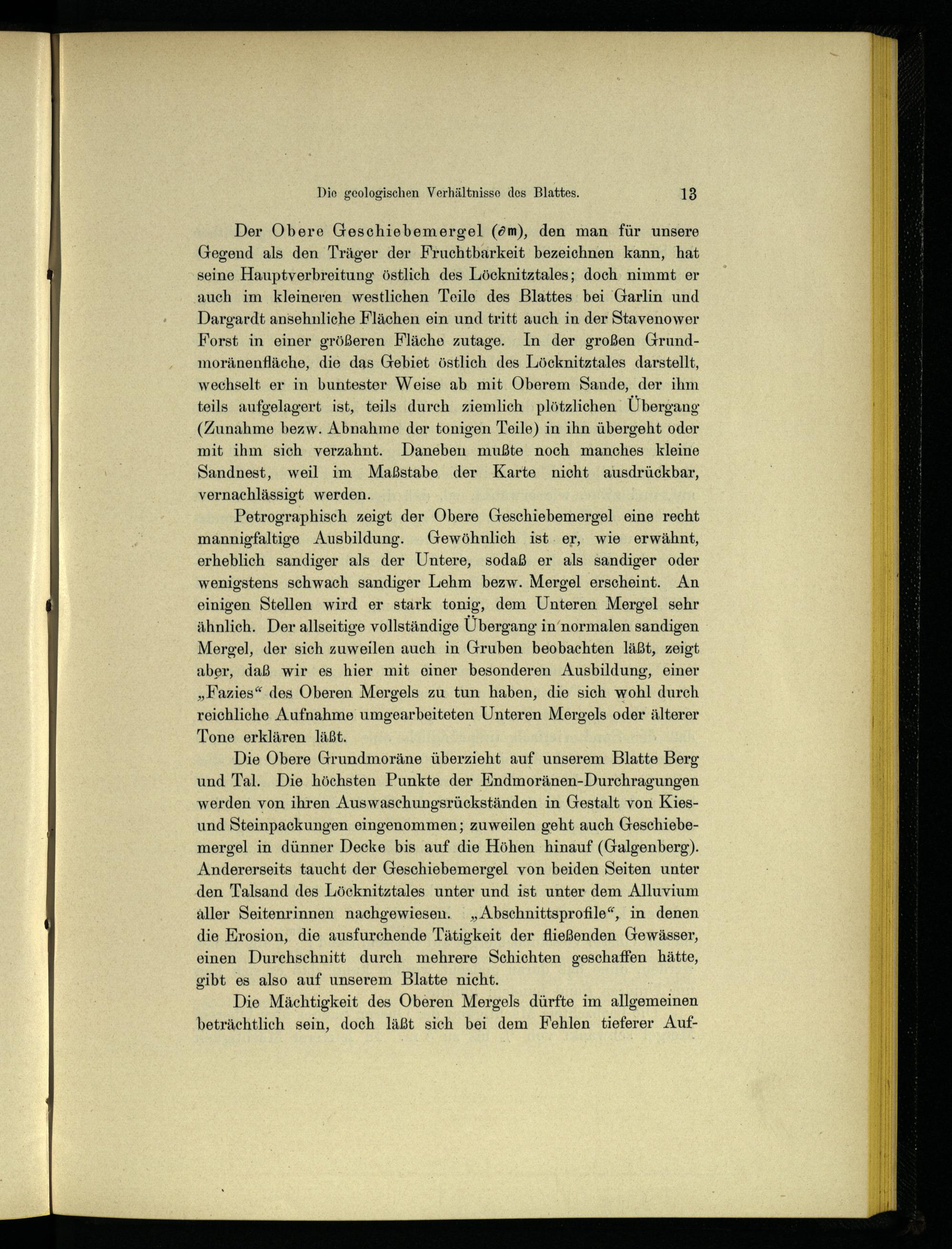 Der Obere Geschiebemergel(öm), den man für unsere Gegend als den Träger der Fruchtbarkeit bezeichnen kann, hat seine Hauptverbreitung östlich des Löcknitztales; doch nimmt er auch im kleineren westlichen Teile des Blattes bei Garlin und Dargardt ansehnliche Flächen ein und tritt auch in der Stavenower Forst in einer größeren Fläche zutage. In der großen Grundmoränenfläche, die das Gebiet östlich des Löcknitztales darstellt, wechselt er in buntester Weise ab mit Oberem Sande, der ihm teils aufgelagert ist, teils durch ziemlich ‚plötzlichen‘ Übergang (Zunahme bezw. Abnahme der tonigen Teile) in ihn übergeht oder mit ihm sich verzahnt. Daneben mußte noch manches kleine Sandnest, weil im Maßstabe der Karte nicht ausdrückbar, vernachlässigt werden.
