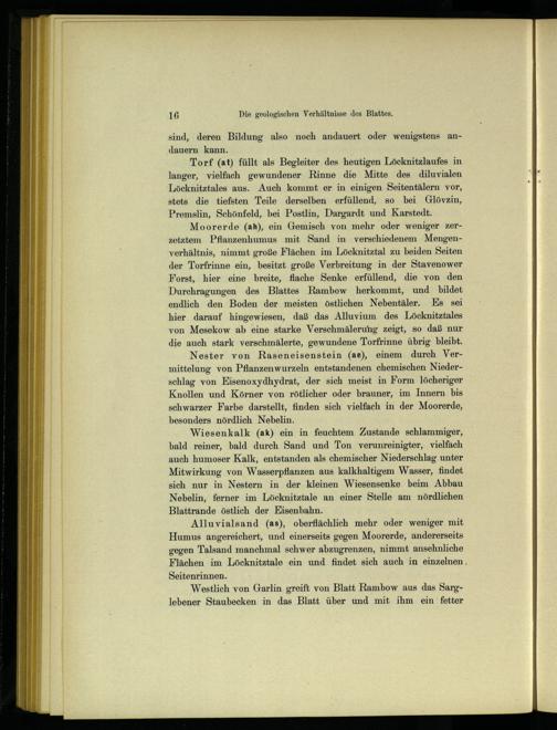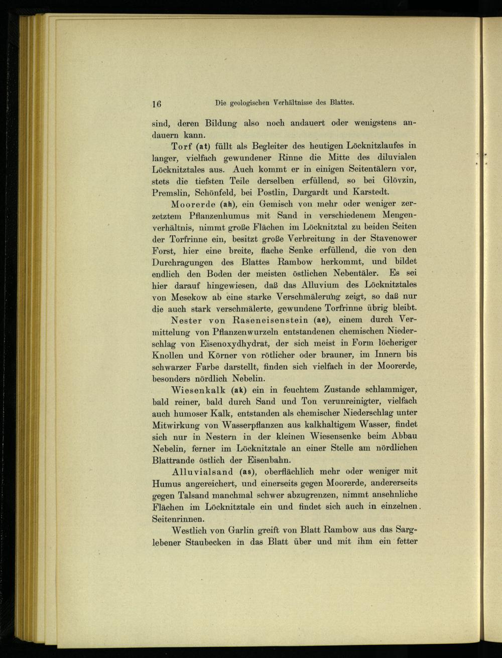 Alluvialsand(as), oberflächlich mehr oder weniger mit Humus angereichert, und einerseits gegen Moorerde, andererseits gegen Talsand manchmal schwer abzugrenzen, nimmt ansehnliche Flächen im Löcknitztale ein und findet sich auch in einzelnen. Seitenrinnen.