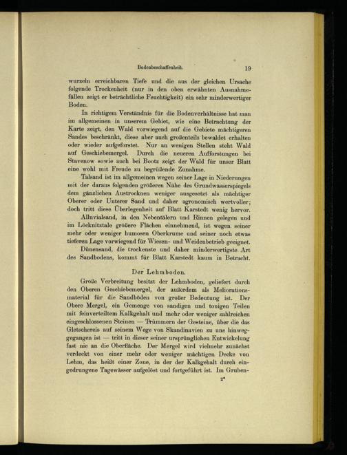 Große Verbreitung besitzt der Lehmboden, geliefert durch den Oberen Geschiebemergel, der außerdem als Meliorationsmaterial für die Sandböden von großer Bedeutung ist. Der Obere Mergel, ein Gemenge von sandigen und tonigen Teilen mit feinverteiltem Kalkgehalt und mehr oder weniger zahlreichen eingeschlossenen Steinen— Trümmern der Gesteine, über die das Gletschereis auf seinem Wege von Skandinavien zu uns hinweggegangen ist— tritt in dieser seiner ursprünglichen Entwickelung fast nie an die Oberfläche. Der Mergel wird vielmehr zunächst verdeckt von einer mehr oder weniger mächtigen Decke von Lehm, das heißt einer Zone, in der der Kalkgehalt durch eingedrungene Tagewässer aufgelöst und fortgeführt ist. Im Gruben