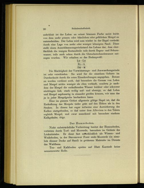 Eine im ganzen Gebiet allgemein giltige Regel ist, daß die Entkalkung des Mergels tiefer geht auf den Höhen als in den Senken. In diesen hat sogar teilweise eine Anreicherung des Kalkes stattgefunden, so daß unter dem Alluvium in den Tälern sogleich Mergel , und zwar manchmal mit besonders starkem Kalkgehalte, folgt.