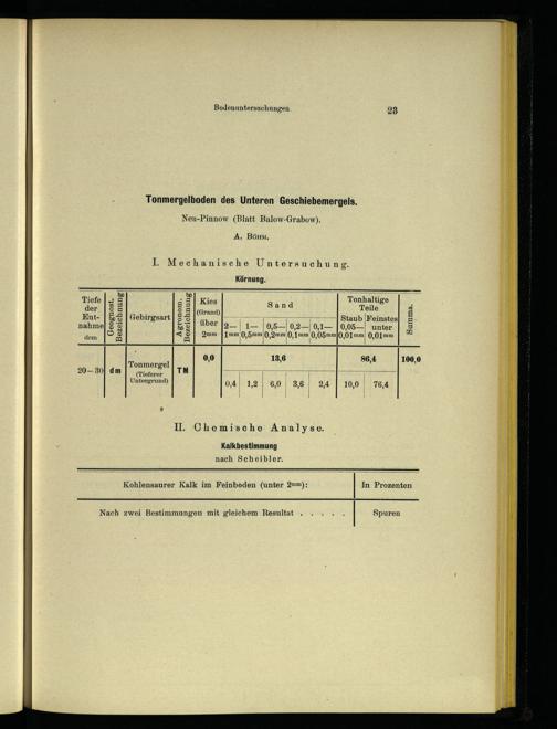 Körnung. m m SET rn EA Tiefe| S; 8| Ki Tonhaltige der[EE BE Sand Teile S Ent-| 58| Gebirgsart| 3£(Or 1 Sub!Feinst S Es ‚2 9 SS über 1] 1 au eınstes Ss]. nahme| 5 8&0 8 2—| 1—|0,5— 0,2—/ 0,1—|0,05—/| unter zZ dem Ds< 8 29mm A O0, 2m 0 lm 0,0077 0,01mm 0,01mm vr! GES Sen 3 EEE ME RE A N PLN SE Tonmergel 0,0 13,6 86,4 100,0 20—30] dm(Tieferer TM A ES rn U Untergrund) 0,4| 1,2| 6,0| 8,6 24| 10,0| 76,4 | ||||| 9