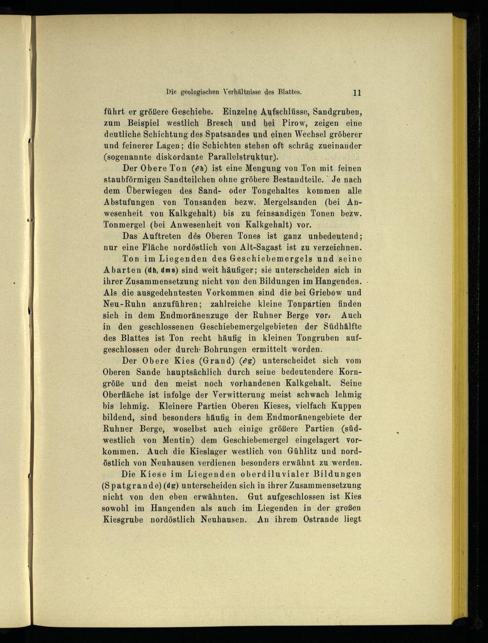 Ton im Liegenden des Geschiebemergels und seine Abarten(dh, dms) sind weit häufiger; sie unterscheiden sich in ihrer Zusammensetzung nicht von den Bildungen im Hangenden. Als die ausgedehntesten Vorkommen sind die bei Griebow und Neu-Ruüuhn anzuführen; zahlreiche kleine Tonpartien finden sich in dem Endmoränenzuge der Ruhner Berge vor: Auch in den geschlossenen Geschiebemergelgebieten der Südhälfte des Blattes ist Ton recht häufig in kleinen Tongruben aufgeschlossen oder durch‘ Bohrungen ermittelt worden.