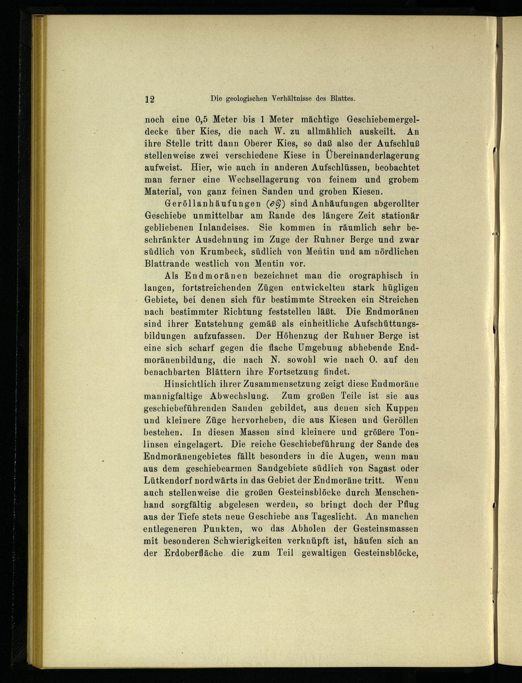 Als Endmoränen bezeichnet man die orographisch in langen, fortstreichenden Zügen entwickelten stark hügligen - Gebiete, bei denen sich für bestimmte Strecken ein Streichen nach bestimmter Richtung feststellen läßt. Die Endmoränen sind ihrer Entstehung gemäß als einheitliche Aufschüttungsbildungen. aufzufassen. Der Höhenzug der Ruhner Berge ist eine sich scharf gegen die flache Umgebung abhebende Endmoränenbildung, ‚die nach N. sowohl wie nach O. auf den benachbarten Blättern ihre Fortsetzung findet.