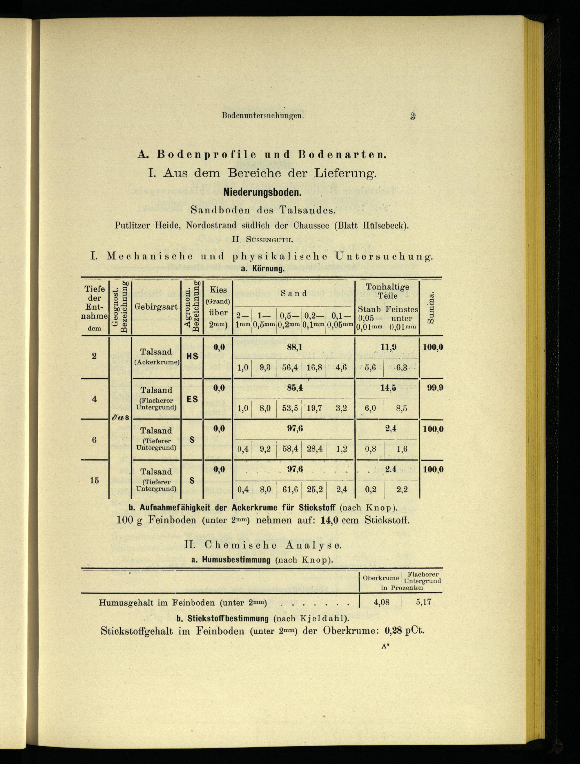 b. Stickstoffbestimmung(nach Kjeldahl). Stickstoffgehalt im Feinboden(unter 2mm) der Oberkrume: 0,28 pCt.