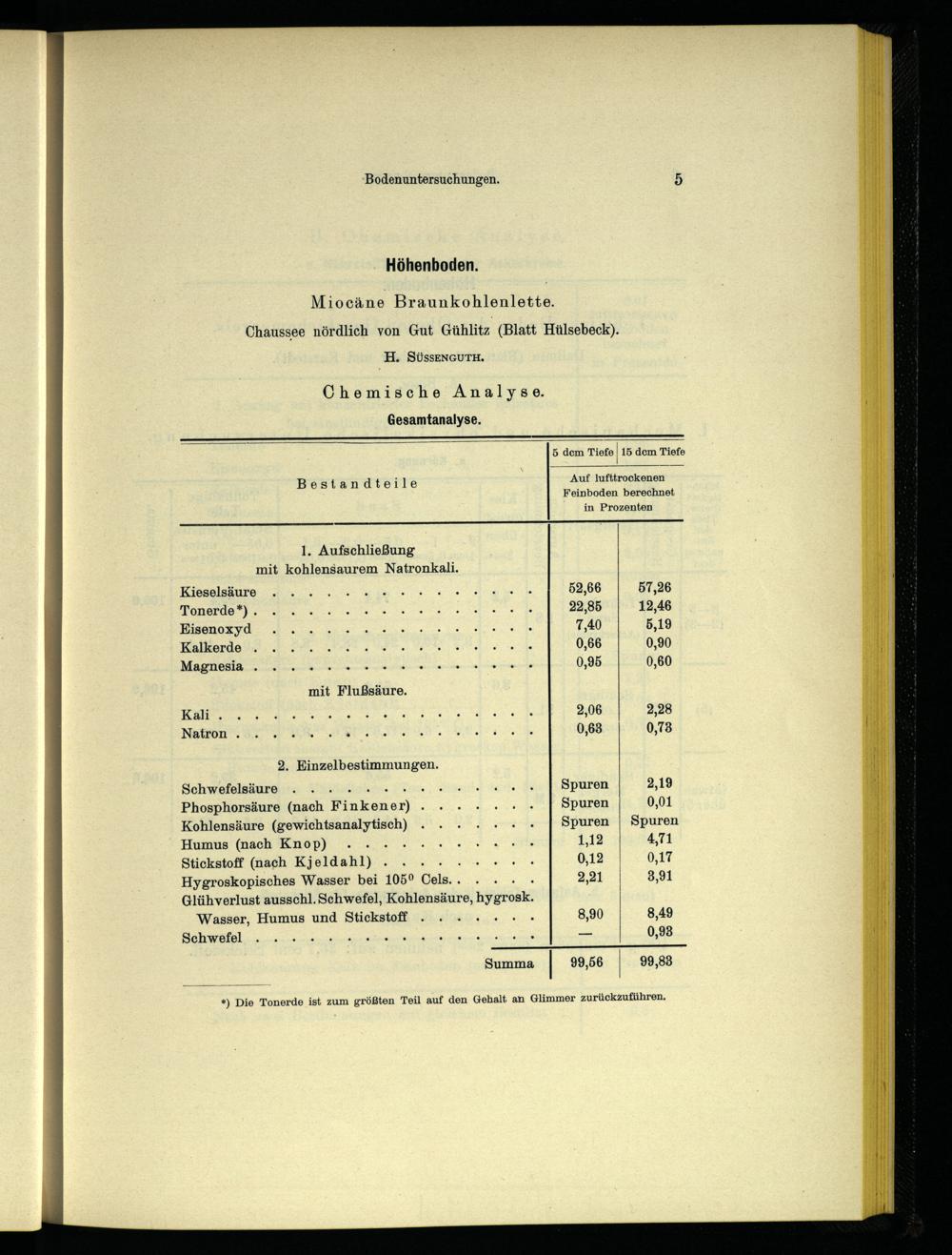 Schwefelsäure... vr wie. Spuren 2,19 Phosphorsäure(nach Finkener). VE Spuren 0,01 Kohlensäure(gewichtsanalytisch)....+.+ Spuren| Spuren Humus(nach Knop).....0.0.0. 4.07% 1,12 4,71 Stickstoff(nach Kjeldahl)... 2 0,12| 0,17 Hygroskopisches Wasser bei 105° Cels.. a 2,21| 83,91 Glühverlust ausschl. Schwefel, Kohlensäure, hYBCOAK!|
