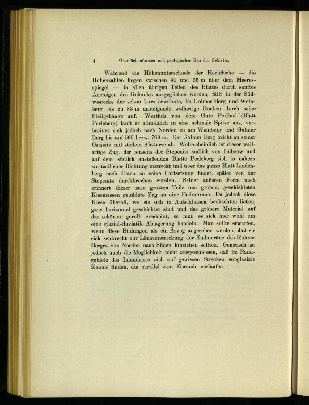 Während die Höhenunterschiede der Hochfläche— die Höhenzahlen liegen zwischen 40 und 66 m über dem Meeresspiegel— in allen übrigen Teilen des Blattes durch sanftes Ansteigen des Geländes ausgeglichen werden, fällt in der Südwestecke der schon kurz erwähnte, im Golmer Berg und Weinberg bis zu 83 m ansteigende wallartige Rücken durch seine Steilgehänge auf. Westlich von dem Gute Perlhof‘(Blatt Perleberg ) läuft er allmählich in eine schmale Spitze aus, verbreitert sich jedoch nach Norden zu am Weinberg und Golmer Berg bis auf 500 bezw. 700 m. Der Golmer Berg bricht an seiner Ostseite mit steilem Absturze ab. Wahrscheinlich ist dieser wallartige Zug, der jenseits der Stepenitz südlich von Lübzow und auf dem südlich anstoßenden Blatte Perleberg sich in nahezu westöstlicher Richtung erstreckt. und über das ganze Blatt Lindenberg nach Osten zu seine Fortsetzung findet, später von. der Stepenitz durchbrochen worden. Seiner äußeren Form nach erinnert dieser zum größten Teile aus groben, geschichteten Kiesmassen gebildete Zug an eine Endmoräne. Da jedoch diese Kiese überall, wo sie sich in Aufschlüssen beobachten ließen, ganz. horizontal geschichtet sind und das gröbere Material auf das schönste gerollt erscheint, so muß es sich hier wohl um eine glazial-Aluviatile Ablagerung handeln. Man sollte erwarten, wenn diese Bildungen als ein Äszug angesehen werden, daß sie sich senkrecht zur Längserstreckung der Endmoräne des Ruhner Berges von Norden nach Süden hinziehen sollten. Genetisch ist jedoch auch die Möglichkeit nicht ausgeschlossen, daß im Randgebiete des Inlandeises sich auf gewissen Strecken subglaziale Kanäle finden, die parallel zum Eisrande. verlaufen.