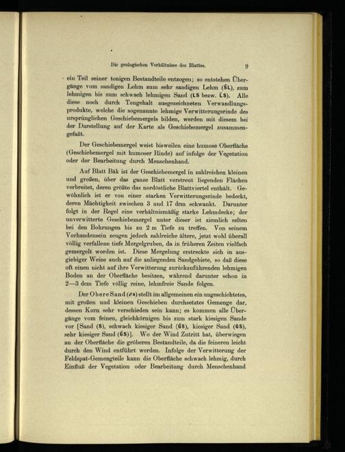 » ein Teil seiner tonigen Bestandteile entzogen; so entstehen Übergänge vom sandigen Lehm zum sehr sandigen Lehm(SL), zum lehmigen bis zum schwach lehmigen Sand(LS bezw. LS). Alle diese noch durch Tongehalt ausgezeichneten Verwandlungsprodukte, welche die sogenannte lehmige Verwitterungsrinde des ursprünglichen Geschiebemergels bilden, werden mit diesem bei der Darstellung auf der Karte als Geschiebemergel zusammengefaßt.: