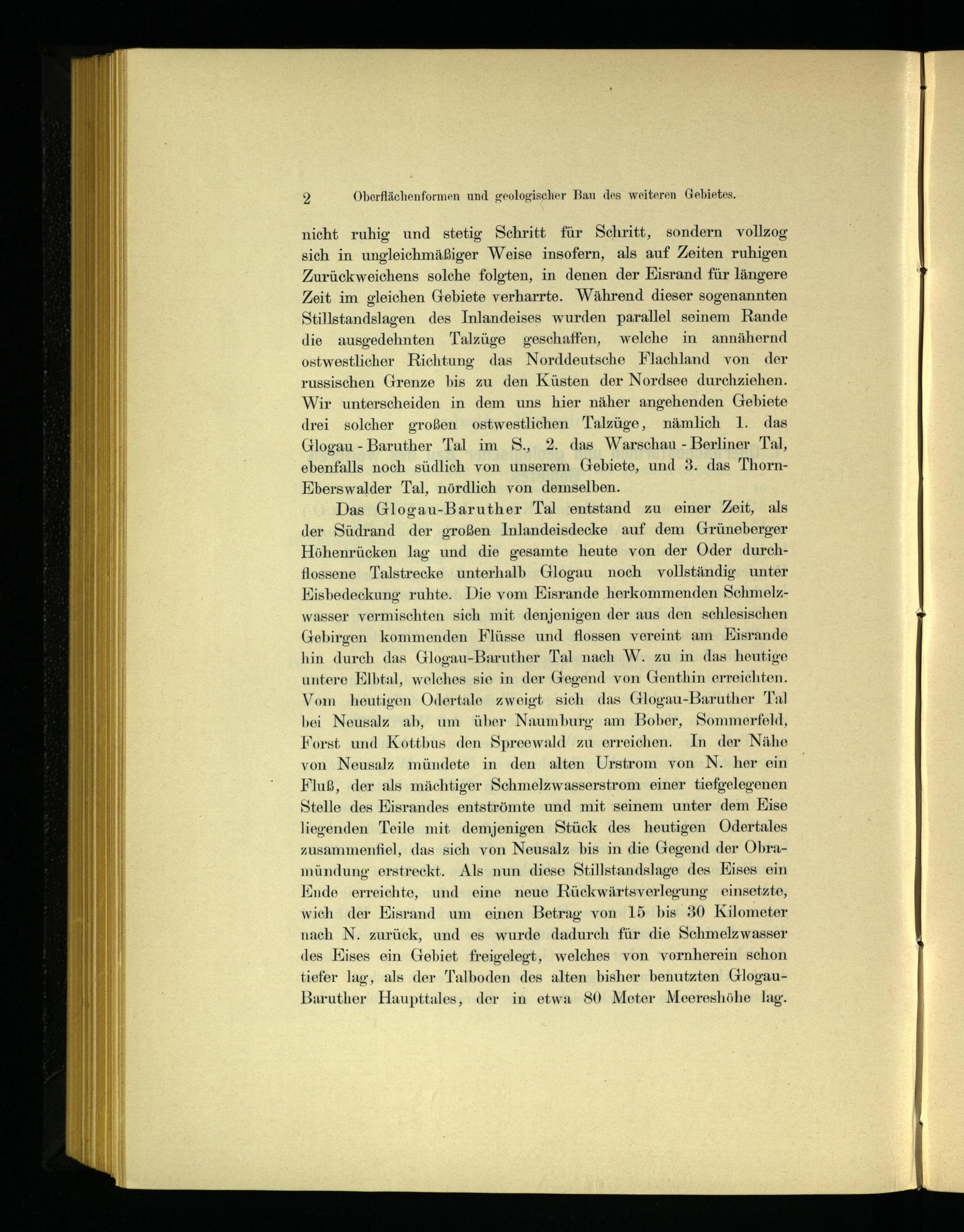 Vom heutigen Odertale zweigt sich das Glogau -Baruther Tal bei Neusalz ab, um über Naumburg am Bober, Sommerfeld, Forst und Kottbus den Spreewald zu erreichen. In der Nähe von Neusalz mündete in den alten Urstrom von N. her ein Fluß, der als mächtiger Schmelzwasserstrom einer tiefgelegenen Stelle des Eisrandes entströmte und mit seinem unter dem Kise liegenden Teile mit demjenigen Stück des heutigen Odertales zusammenfiel, das sich von Neusalz bis in die Gegend der Obramündung erstreckt. Als nun diese Stillstandslage des Kises ein Ende erreichte, und eine neue Rückwärtsverlegung einsetzte, wich der Eisrand um einen Betrag von 15 bis 30 Kilometer nach N. zurück, und es wurde dadurch für die Schmelzwasser des Eises ein Gebiet freigelegt, welches von vornherein schon tiefer lag, als der Talboden des alten bisher benutzten GlogauBaruther Haupttales, der in etwa S0 Meter Meereshöhe lag.
