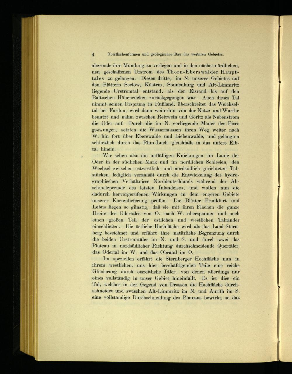 Wir sehen also die auffälligen Knickungen im Laufe der Oder in der südlichen Mark und im nördlichen Schlesien, den Wechsel zwischen ostwestlich und nordsüdlich gerichteten Talstücken lediglich veranlaßt durch die Entwickelung der hydrographischen Verhältnisse Norddeutschlands während der Abschmelzperiode des letzten Inlandeises, und wollen nun die dadurch hervorgerufenen Wirkungen in dem engeren Gebiete unserer Kartenlieferung prüfen. Die Blätter Frankfurt und Lebus liegen so günstig, daß sie mit ihren Flächen die ganze Breite des Odertales von O. nach W. überspannen und noch einen großen"Teil der östlichen und westlichen Talränder einschließen. Die östliche Hochfläche wird als das Land Sternberg bezeichnet und erfährt ihre natürliche Begrenzung durch die beiden Urstromtäler im N. und S. und durch zwei das Plateau in nordsüdlicher Richtung durchschneidende Quertäler, das Odertal im W. und das Obratal im O.