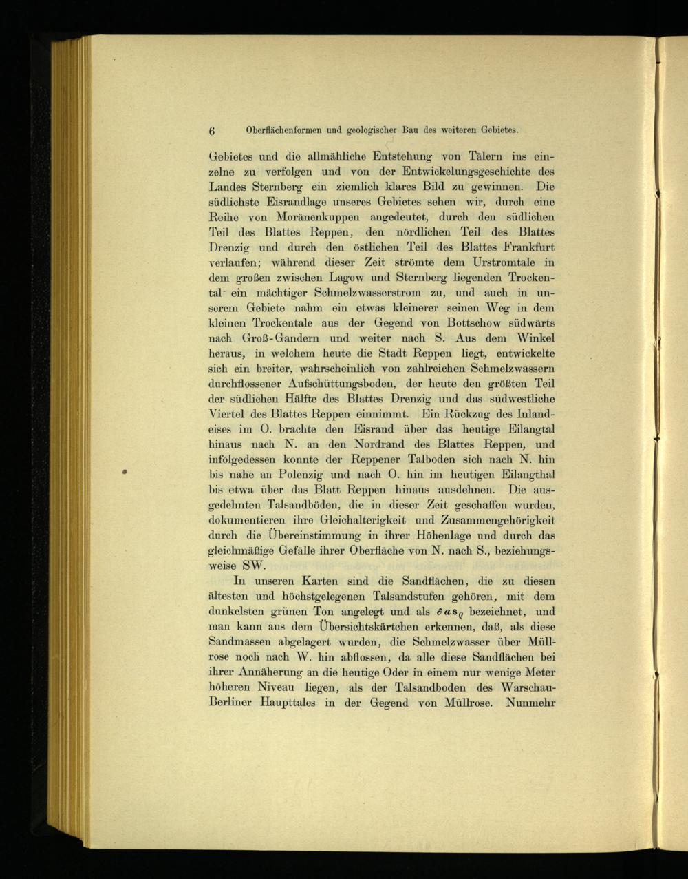 Gebietes und die allmähliche Entstehung von Tälern ins einzelne zu verfolgen und von der Entwickelungsgeschichte des Landes Sternberg ein ziemlich klares Bild zu gewinnen. Die südlichste KEisrandlage unseres Gebietes sehen wir, durch eine Reihe von Moränenkuppen angedeutet, durch den südlichen Teil des Blattes Reppen , den nördlichen Teil des Blattes Drenzig und durch den östlichen Teil des Blattes Frankfurt verlaufen; während dieser Zeit strömte dem Urstromtale in dem großen zwischen Lagow und Sternberg liegenden Trockental” ein mächtiger Schmelzwasserstrom zu, und auch in unserem Gebiete nahm ein etwas kleinerer seinen Weg in dem kleinen Trockentale aus der Gegend von Bottschow südwärts nach Groß-Gandern und weiter nach S. Aus dem Winkel heraus, in welchem heute die Stadt Reppen liegt, entwickelte sich ein breiter, wahrscheinlich von zahlreichen Schmelzwassern durchflossener Aufschüttungsboden, der heute den größten Teil der südlichen Hälfte des Blattes Drenzig und das südwestliche Viertel des Blattes Reppen einnimmt. Ein Rückzug des Inlandeises im O. brachte den Kisrand über das heutige KEilangtal hinaus nach N. an den Nordrand des Blattes Reppen , und infolgedessen. konnte der Reppener Talboden sich nach N. hin bis nahe an Polenzig und nach O. hin im heutigen Eilangthal bis etwa über das Blatt Reppen hinaus ausdehnen. Die ausgedehnten Talsandböden, die in dieser Zeit geschaffen wurden, dokumentieren. ihre Gleichalterigkeit und Zusammengehörigkeit durch die Übereinstimmung in ihrer Höhenlage und durch das gleichmäßige Gefälle ihrer Oberfläche von N. nach S., beziehungsweise SW.