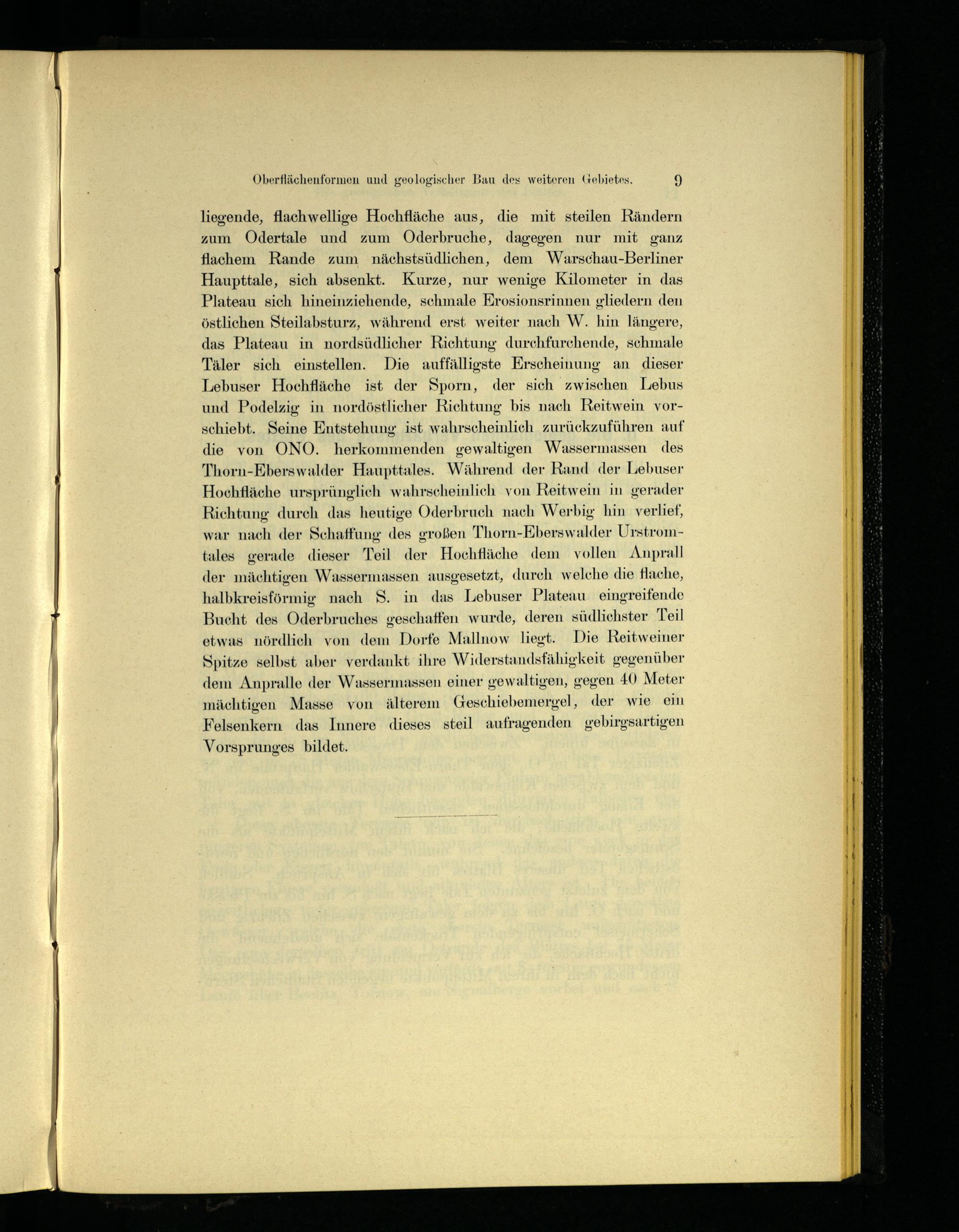 liegende, flachwellige Hochfläche aus, die mit steilen Rändern zum Odertale und zum ÖOderbruche, dagegen nur mit ganz flachem Rande zum nächstsüdlichen, dem Warschau -Berliner Haupttale, sich absenkt. Kurze, nur wenige Kilometer in das Plateau sich hineinziehende, schmale Erosionsrinnen gliedern den östlichen Steilabsturz, während erst weiter nach W. hin längere, das Plateau in nordsüdlicher Richtung durchfurchende, schmale Täler sich einstellen. Die auffälligste Erscheinung an dieser Lebuser Hochfläche ist der Sporn, der sich zwischen Lebus und Podelzig in nordöstlicher Richtung bis nach Reitwein vorschiebt. Seine Entstehung ist wahrscheinlich zurückzuführen auf die von ONO. herkommenden gewaltigen Wassermassen des Thorn-Eberswalder Haupttales. Während der Rand der Lebuser Hochfläche ursprünglich wahrscheinlich von Reitwein in gerader Richtung durch das heutige Oderbruch nach Werbig hin verlief, war nach der Schaffung des großen Thorn-Eberswalder Urstromtales gerade dieser Teil der Hochfläche dem vollen Anprall der mächtigen Wassermassen ausgesetzt, durch welche die flache, halbkreisförmig nach S. in das Lebuser Plateau eingreifende Bucht des Oderbruches geschaffen wurde, deren südlichster Teil etwas nördlich von dem Dorfe Mallnow liegt. Die Reitweiner Spitze selbst aber verdankt ihre Widerstandsfähigkeit gegenüber dem Anpralle der Wassermassen einer gewaltigen, gegen 40 Meter mächtigen Masse von älterem Geschiebemergel, der wie ein Felsenkern das Innere dieses steil aufragenden gebirgsartigen