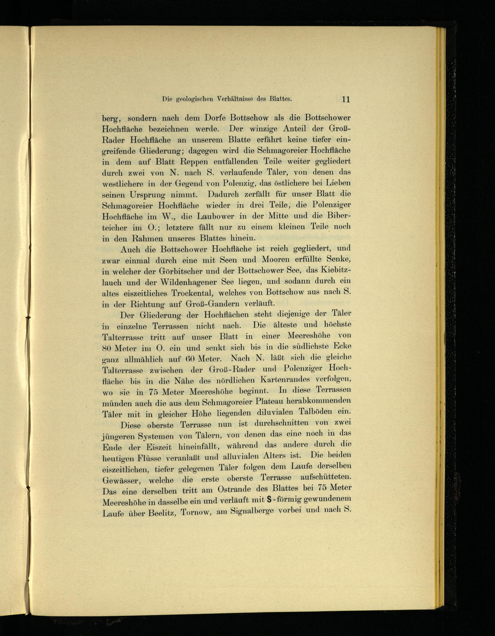 Der Gliederung der Hochflächen steht diejenige der Täler in einzelne Terrassen nicht nach. Die älteste und höchste Talterrasse tritt auf unser Blatt in einer Meereshöhe von 80 Meter im O. ein und senkt sich bis in die südlichste Keke ganz allmählich auf 60 Meter. Nach N. läßt sich die gleiche Talterrasse zwischen der Groß-Rader und Polenziger Hochflüche‘ bis in die Nähe des nördlichen Kartenrandes verfolgen, wo sie in 75 Meter Meereshöhe beginnt. In diese Terrassen münden auch die aus dem Schmagoreier Plateau herabkommenden Täler mit in gleicher Höhe liegenden diluvialen Talböden ein.