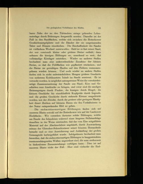 Die endmoränenartigen Bildungen finden sich auf unserem Blatte sowohl auf der Bottschower wie auf der Laubower Hochfläche. Wir verstehen darunter solche Bildungen, welche am Rande des Inlandeises während einer längeren Stillstandslage desselben in der Weise entstanden, daß das vom Eise mitgeführte Material auf der Abschmelzlinie angehäuft, durch Auswaschung seitens der Gletscher-Schmelzwässer seiner feineren Bestandteile beraubt und so eine Anreicherung und Anhäufung der groben Gemengteile herbeigeführt wurde. Infolgedessen beobachtet man bisweilen, daß die endmoränenartigen Bildungen in langgestreckten zusammenhängenden Wällen angeordnet sind, die man meilenweit in. lückenlosem Zusammenhange verfolgen kann. Dies ist auf unserem. Blatte nicht der Fall.: Hier: sind vielmehr‘ die End