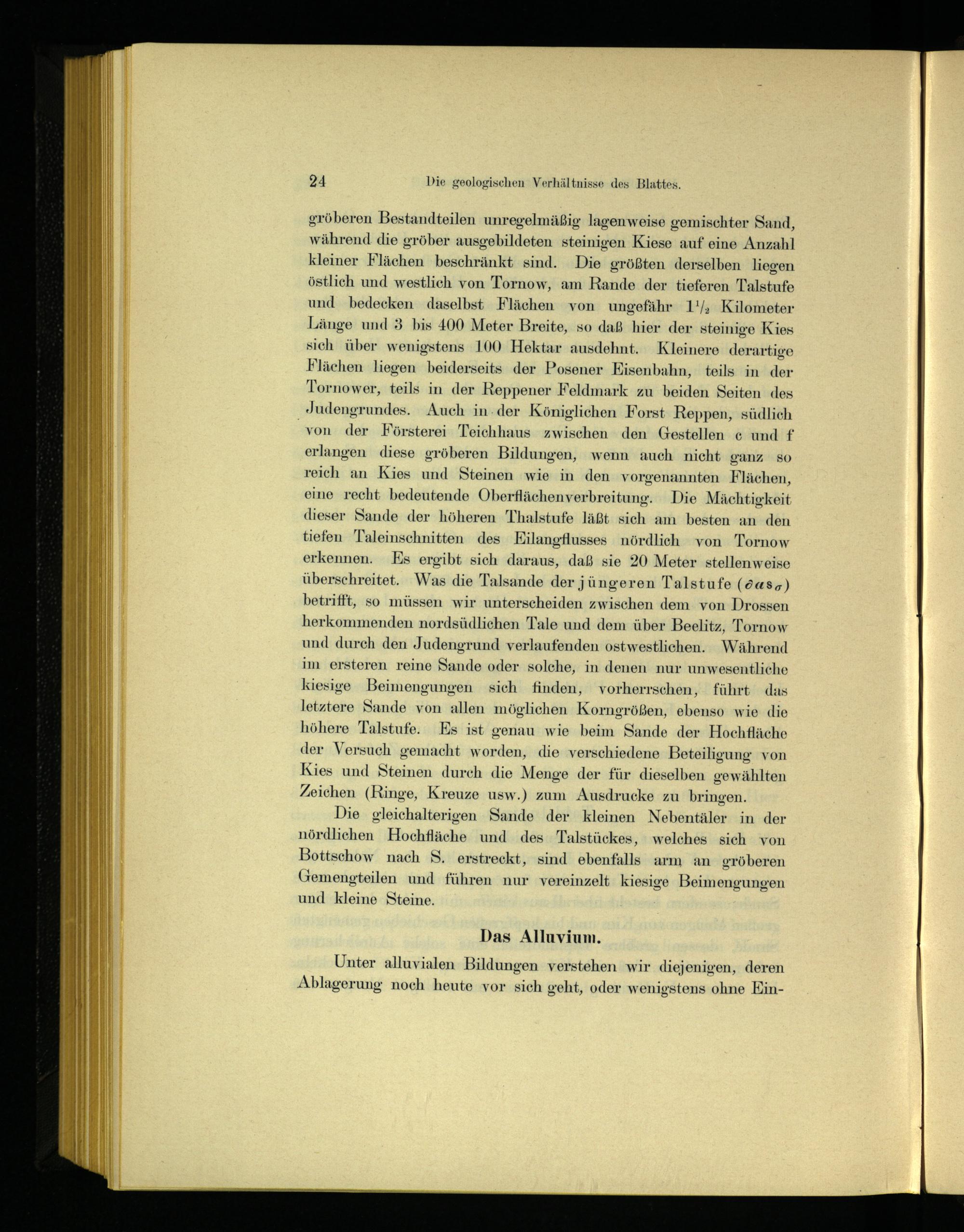 gröberen Bestandteilen unregelmäßig lagenweise gemischter Sand, während die gröber ausgebildeten steinigen Kiese auf eine Anzahl kleiner Flächen beschränkt sind. Die größten derselben liegen östlich und westlich von Tornow, am Rande der tieferen Talstufe und bedecken daselbst Flächen von ungefähr 1½ Kilometer Länge und 3 bis 400 Meter Breite, so daß hier der steinige Kies sich über wenigstens 100 Hektar ausdehnt. Kleinere derartige Flächen liegen beiderseits der Posener Eisenbahn, teils in der Tornower, teils in der Reppener Feldmark zu beiden Seiten des Judengrundes. Auch in der Königlichen Forst Reppen, südlich von der Försterei Teichhaus zwischen den Gestellen c und f erlangen diese gröberen Bildungen, wenn auch nicht ganz so reich an Kies und Steinen wie in den vorgenannten Flächen, eine recht bedeutende Oberflächenverbreitung. Die Mächtigkeit dieser Sande der höheren Thalstufe läßt sich am besten an den tiefen Taleinschnitten des Eilangflusses nördlich von Tornow erkennen. Es ergibt sich daraus, daß sie 20 Meter stellenweise überschreitet. Was die Talsande der jüngeren Talstufe( ousa) betrifft, so müssen wir unterscheiden zwischen dem von Drossen herkommenden nordsüdlichen Tale und dem über Beelitz , Tornow und durch den Judengrund verlaufenden ostwestlichen. Während im ersteren reine Sande oder solche, in denen nur unwesentliche kiesige Beimengungen sich finden, vorherrschen, führt das letztere Sande von allen möglichen Korngrößen, ebenso wie die höhere Talstufe. Es ist genau wie beim Sande der Hochfläche der Versuch gemacht worden, die verschiedene Beteiligung von Kies und Steinen durch die Menge der für dieselben gewählten Zeichen( Ringe, Kreuze usw.) zum Ausdrucke zu bringen.