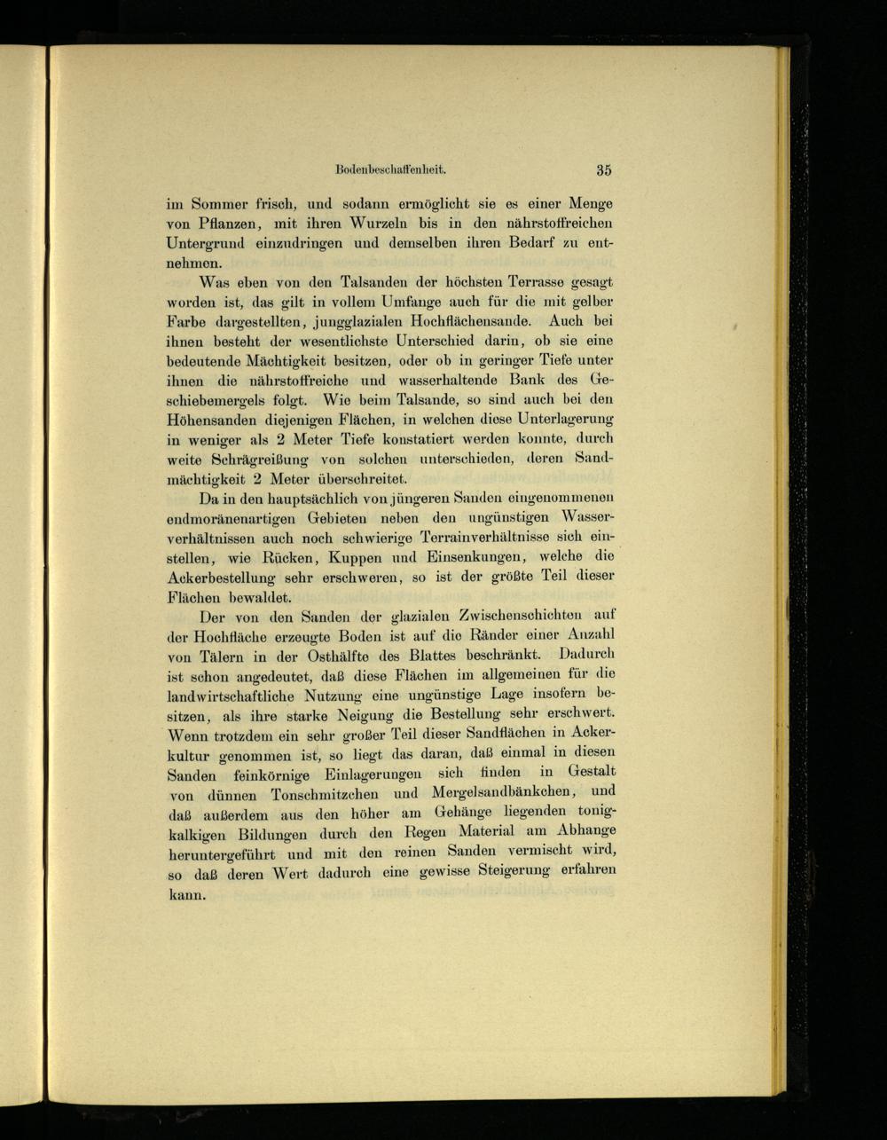Der von den Sanden der glazialen Zwischenschichten auf der Hochfläche erzeugte Boden ist auf dio Ränder einer Anzahl von Tälern in der Osthälfte des Blattes beschränkt. Dadurch ist schon angedeutet, daß diese Flächen im allgemeinen für die Jandwirtschaftliche Nutzung eine ungünstige Lage insofern besitzen, als ihre starke Neigung die Bestellung sehr erschwert. Wenn trotzdem ein sehr großer Teil dieser Sandflächen in Ackerkultur genommen ist, so liegt das daran, daß einmal in diesen Sanden feinkörnige Einlagerungen sich finden in Gestalt von dünnen Tonschmitzchen und Mergelsandbänkchen, und daß außerdem aus den höher am Gehänge liegenden tonigkalkigen Bildungen durch den Regen Material am Abhange heruntergeführt und mit den reinen Sanden vermischt wird, so daß deren Wert dadurch eine gewisse Steigerung erfahren
