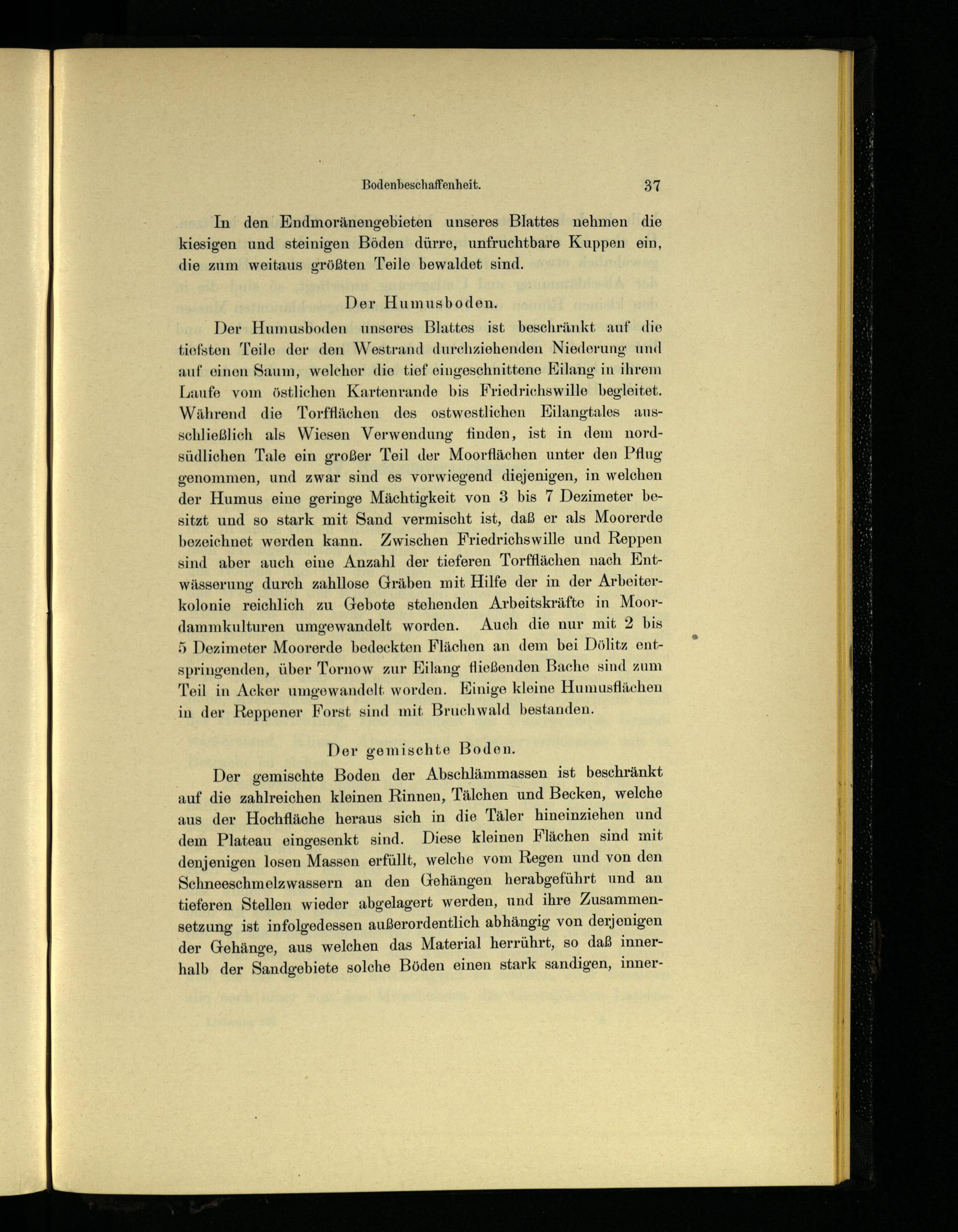 Der Humusboden unseres Blattes ist beschränkt auf die tiefsten Teile der den Westrand durchziehenden Niederung und auf einen Saum, welcher die tief eingeschnittene Kilang in ihrem Laufe vom östlichen Kartenrande bis Friedrichswille begleitet. Während die Torfflächen des ostwestlichen Kilangtales ausschließlich als Wiesen Verwendung finden, ist in dem nordsüdlichen Tale ein großer Teil der Moorflächen unter den Pflug genommen, und zwar sind es vorwiegend diejenigen, in welchen der Humus eine geringe Mächtigkeit von 3 bis 7 Dezimeter besitzt und so stark mit Sand vermischt ist, daß er als Moorerde bezeichnet werden kann. Zwischen Friedrichswille und Reppen sind aber auch eine Anzahl der tieferen Torfflächen nach KEntwässerung durch zahllose Gräben mit Hilfe der in der Arbeiterkolonie reichlich zu Gebote stehenden Arbeitskräfte in Moor