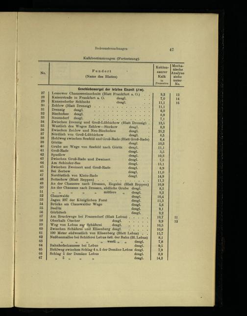 27 Lossower Chausseeeinschnitt(Blatt Frankfurt a. 0)... 9,38 13 28 Kaiserstraße in Frankfurt a. O. desgl. An 7,0 14 29 Kunersdorfer Schlucht desgl. in 11,1 16 30 Zohlow(Blatt Drenzig) A Ne 11,1 31 Drenzig desgl. A 6,0 32 Bischofsee desgl. PR NR N a, 8,9 33 Neuendorf desgl. VUN 71 34 Zwischen Drenzig und Groß-Lübbichow(Blatt Drenzig). 13,5 35 Westlich des Weges Zohlow—Storkow desg]l.. 8,0 36 Zwischen Zotilow und Neu-Bischofsee desgl.. 25,2 37 Nördlich von Groß-Lübbichow desgl.; 8,5 38 Hohlweg zwischen Seefeld und Groß-Rade(Blatt Groß-Rade) 6,4 39 Göritz desgl. 10,3 40 Grube am Wege von Seefeld nach Göritz desgl. 11,1 41 Groß-Rade desgl. 3,5 42 Spudlow desgl. 110,8 4: Zwischen Groß-Rade und Zweinert desgl. 7,8 44 Am Schinder-See desgl. 15;1 45 Zwischen Zweinert und Groß-Rade desgl. 6,9 46 Bei Zerbow desgl. 11,0 47 Nordöstlich von Klein-Rade desgl. 14,9 48 Bottschow(Blatt Reppen) N 11,2 49 An der Chaussee nach Drossen, Ziegelei(Blatt Reppen) 10,9 50 An der Chaussee nach Drossen , südliche Grube desgl. 8,3 51 u”»» mittlere ,, desgl. 9,2 52 Clauswalde desgl. 10,4 53 Jagen 237 der Königlichen Forst desgl. 11,38 54 Brücke am Clauswalder Wege desgl. 5,6 55 Beelitz desgl. 9,1 56 Görbitsch desgl. 9,2 57 Am Bruchwege bei Frauendorf(Blatt Lebus )..... 10,7 11 58 Oberhalb Ötscher desgl. A 9,9 12 59 Weg von Lebus zur Schäferei desgl. RN 10,5 60 Zwischen Schäferei und Elisenberg desgl. 10,8 61 100 Meter südwestlich von Elisenberg(Blatt Lebus ).. 15,7 62 Nußbaumallee bei Schäferei Lebus östl. der Bahn(Bl. Lebus) 8,1 68„*»„west desgl. 7,8 64 Bahnhofschaussee bei Lebus desgl. 9,5 65 Hohlweg zwischen Schlag 4 u.5 der Domäne Lebus desgl. 7,9