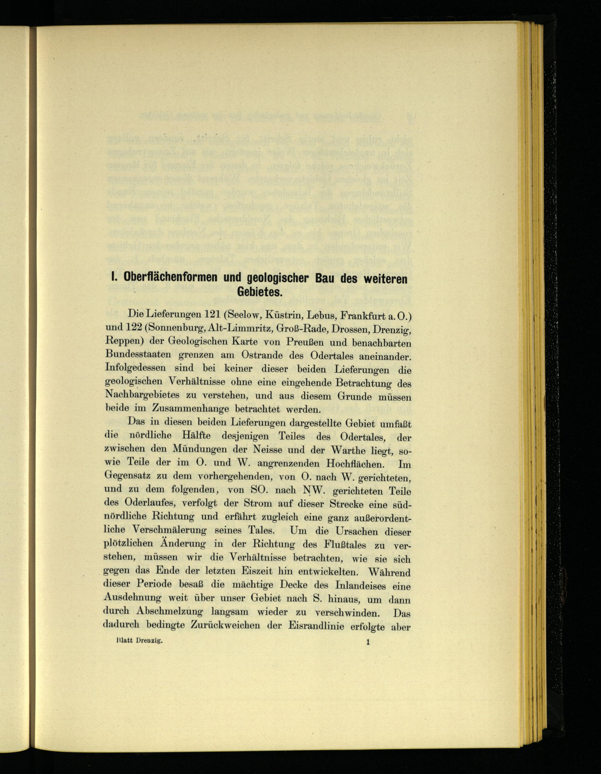Das in diesen beiden Lieferungen dargestellte Gebiet umfaßt die nördliche Hälfte desjenigen"Teiles des Odertales, der zwischen den Mündungen der Neisse und der Warthe liegt, sowie Teile der im O. und W. angrenzenden Hochflächen. Im Gegensatz zu dem vorhergehenden, von O. nach W. gerichteten, und zu dem folgenden, von SO. nach NW. gerichteten Teile des Oderlaufes, verfolgt der Strom auf dieser Strecke eine südnördliche Richtung und erfährt zugleich eine ganz außerordentliche Verschmälerung seines Tales. Um die Ursachen dieser plötzlichen Änderung in der Richtung des Flußtales zu verstehen, müssen wir die Verhältnisse betrachten, wie sie sich gegen das Ende der letzten Kiszeit hin entwickelten. Während dieser Periode besaß die mächtige Decke des Inlandeises eine Ausdehnung weit über unser Gebiet nach S. hinaus, um dann durch Abschmelzung langsam wieder zu verschwinden. Das dadurch bedingte Zurückweichen der Eisrandlinie erfolgte aber