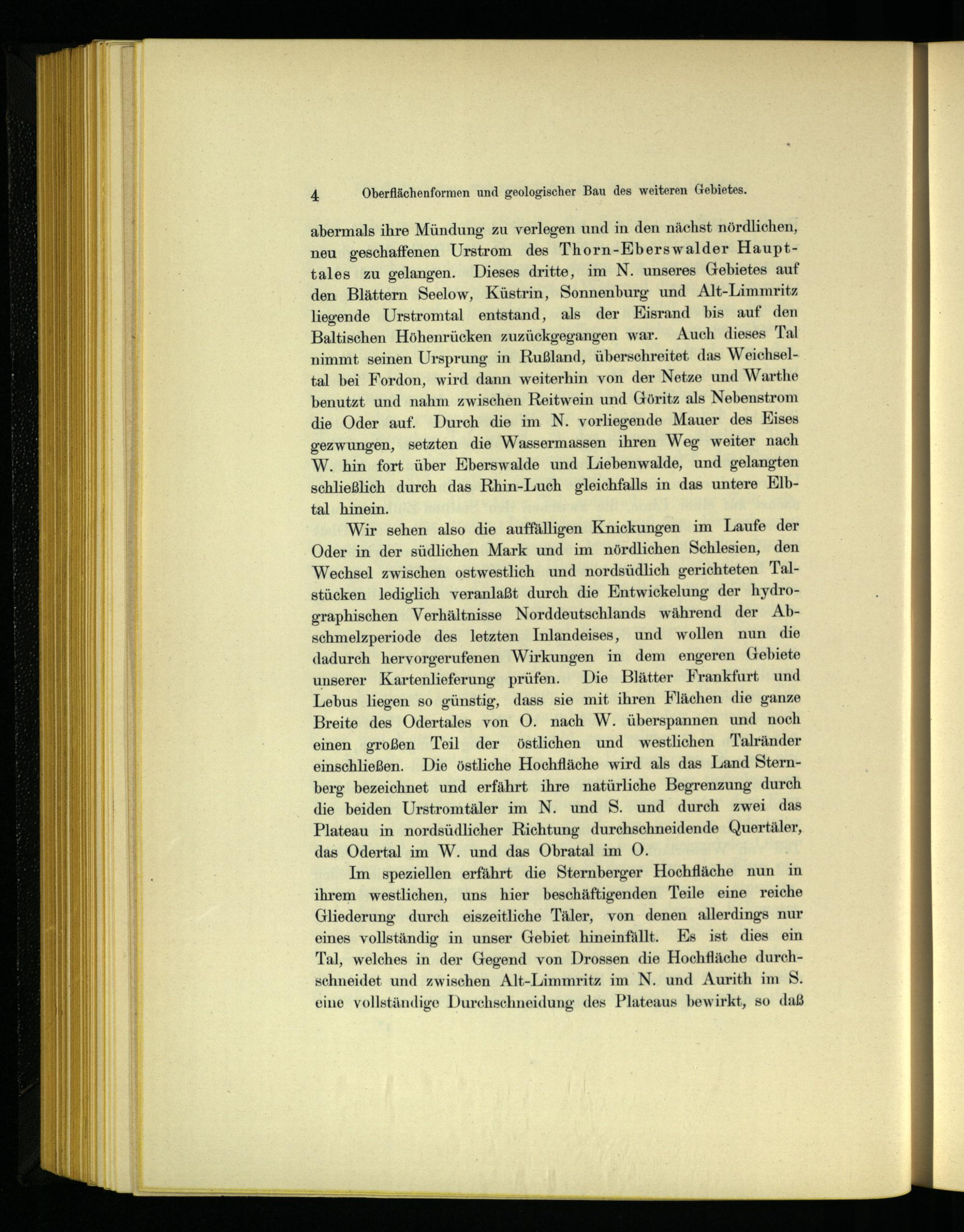 Wir sehen also die auffälligen Knickungen im Laufe der Oder in der südlichen Mark und im nördlichen Schlesien, den Wechsel zwischen ostwestlich und nordsüdlich gerichteten"Talstücken lediglich veranlaßt durch die Entwickelung der hydrographischen Verhältnisse Norddeutschlands während der Abschmelzperiode des letzten Inlandeises, und wollen nun die dadurch hervorgerufenen Wirkungen in dem engeren Gebiete unserer Kartenlieferung prüfen. Die Blätter Frankfurt und Lebus liegen so günstig, dass sie mit ihren Flächen die ganze Breite des Odertales von O. nach W. überspannen und noch einen großen Teil der östlichen und westlichen Talränder einschließen. Die östliche Hochfläche wird als das Land Sternberg bezeichnet und erfährt ihre natürliche Begrenzung durch die beiden Urstromtäler im N. und S. und durch zwei das Plateau in nordsüdlicher Richtung durchschneidende Quertäler, das Odertal im W. und das Obratal im O.