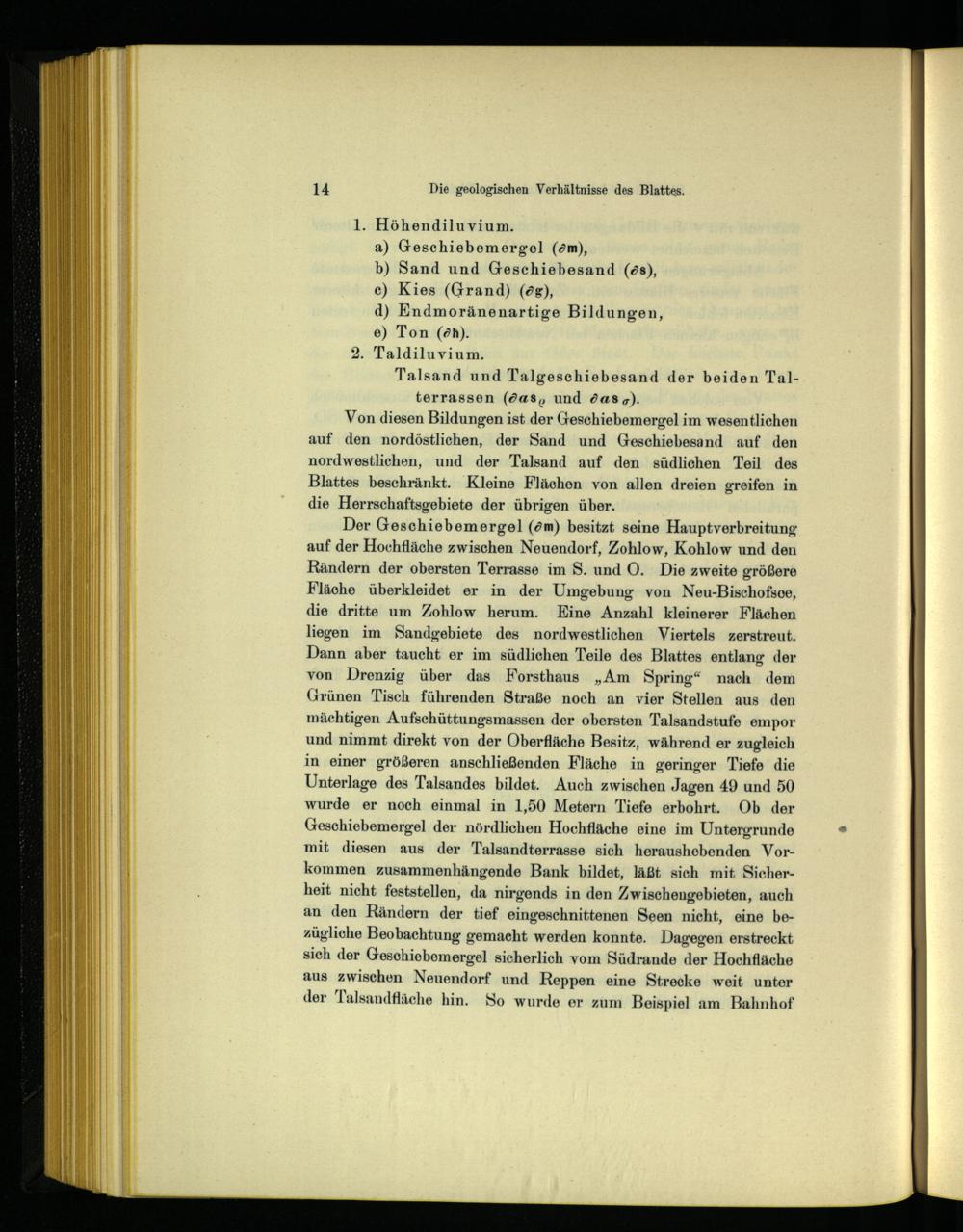 Der Geschiebemergel(öm) besitzt seine Hauptverbreitung auf der Hochfläche zwischen Neuendorf, Zohlow, Kohlow und den Rändern der obersten Terrasse im S. und O. Die zweite größere Fläche überkleidet er in der Umgebung von Neu-Bischofsee, die dritte um Zohlow herum. Eine Anzahl kleinerer Flächen liegen im Sandgebiete des nordwestlichen Viertels zerstreut. Dann aber taucht er im südlichen Teile des Blattes entlang der von Drenzig über das Forsthaus„Am Spring“ nach dem Grünen Tisch führenden Straße noch an vier Stellen aus den mächtigen Aufschüttungsmassen der obersten Talsandstufe empor und nimmt direkt von der Oberfläche Besitz, während er zugleich in einer größeren anschließenden Fläche in geringer Tiefe die Unterlage des Talsandes bildet. Auch zwischen Jagen 49 und 50 wurde er noch einmal in 1,50 Metern Tiefe erbohrt. Ob der Geschiebemergel der nördlichen Hochfläche eine im Untergrunde mit diesen aus der Talsandterrasse sich heraushebenden Vorkommen zusammenhängende Bank bildet, läßt sich mit Sicherheit nicht feststellen, da nirgends in den Zwischengebieten, auch an den Rändern der tief eingeschnittenen Seen nicht, eine bezügliche Beobachtung gemacht werden konnte. Dagegen erstreckt sich der Geschiebemergel sicherlich vom Südrande der Hochfläche aus zwischen Neuendorf und Reppen eine Strecke weit unter der Talsandfläche hin. So wurde er zum Beispiel am. Bahnhof