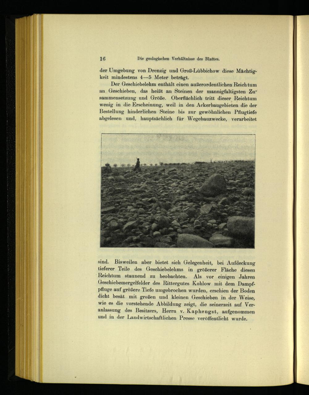 Der Geschiebelehm enthält einen außerordentlichen Reichtum an, Geschieben, das heißt an Steinen der mannigfaltigsten Zur sammensetzung und Größe. Oberflächlich tritt dieser Reichtum wenig in die Erscheinung, weil in den Ackerbaugebieten die der Bestellung hinderlichen Steine bis zur gewöhnlichen Pflugtiefe abgelesen und, hauptsächlich für Wegebauzwecke, verarbeitet