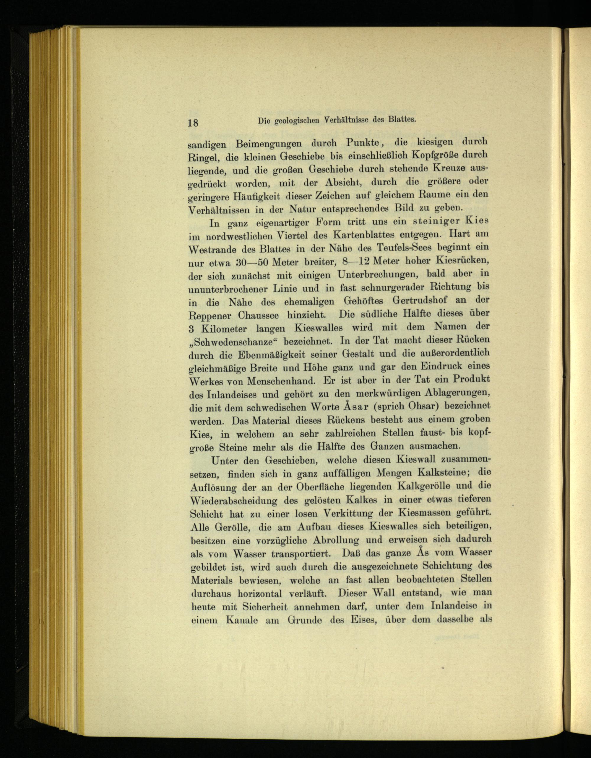 In ganz eigenartiger Form tritt uns ein steiniger Kies im nordwestlichen Viertel des Kartenblattes entgegen. Hart am Westrande des Blattes in der Nähe des Teufels-Sees beginnt ein nur etwa 30—B50 Meter breiter, S—12 Meter hoher Kiesrücken, der sich zunächst mit einigen Unterbrechungen, bald aber in ununterbrochener Linie und in fast schnurgerader Richtung bis in die Nähe des ehemaligen Gehöftes Gertrudshof an der Reppener Chaussee hinzieht. Die südliche Hälfte dieses über 3 Kilometer langen Kieswalles wird mit dem Namen der „Schwedenschanze“ bezeichnet. In der Tat macht dieser Rücken durch die Ebenmäßigkeit seiner Gestalt und die außerordentlich gleichmäßige Breite und Höhe ganz und gar den Eindruck eines Werkes von Menschenhand. Er ist aber in der Tat ein Produkt des Inlandeises und gehört zu den merkwürdigen Ablagerungen, die mit dem schwedischen Worte Äsar(sprich Ohsar) bezeichnet werden. Das Material dieses Rückens besteht aus einem groben Kies, in welchem an sehr zahlreichen Stellen faust- bis kopfgroße Steine mehr als die Hälfte des Ganzen ausmachen.