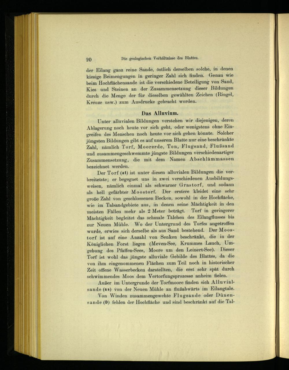 Unter alluvialen Bildungen verstehen wir diejenigen, deren Ablagerung noch heute vor sich geht, oder wenigstens ohne Eingreifen des Menschen noch heute vor sich gehen könnte. Solcher jüngsten Bildungen gibt es auf unserem Blatte nur eine beschränkte Zahl, nämlich Torf, Moorerde, Ton, Flugsand, Flußsand und zusammengeschwemmte jüngste Bildungen verschiedenartiger Zusammensetzung, die mit dem Namen Abschlämmassen bezeichnet werden.: