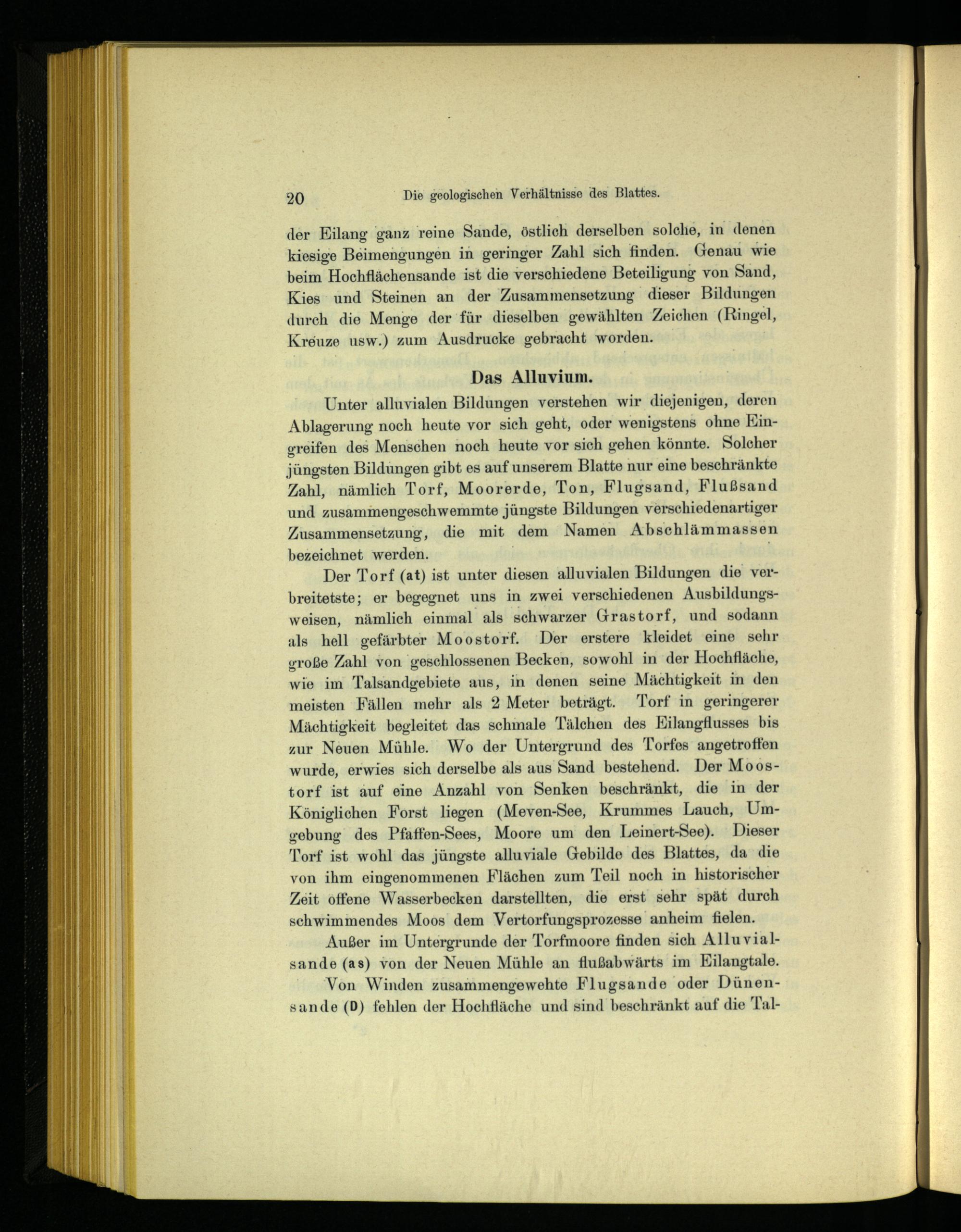 Der Torf(at) ist unter diesen alluvialen Bildungen die verbreitetste; er begegnet uns in zwei verschiedenen Ausbildungsweisen, nämlich einmal als schwarzer Grastorf, und sodann als hell gefärbter Moostorf. Der erstere kleidet eine sehr große Zahl von geschlossenen Becken, sowohl in der Hochfläche, wie im Talsandgebiete aus, in denen seine Mächtigkeit in den meisten Fällen mehr als 2 Meter beträgt."Torf in geringerer Mächtigkeit begleitet das schmale Tälchen des Kilangflusses bis zur Neuen Mühle. Wo der Untergrund des"Forfes angetroffen wurde, erwies sich derselbe als aus Sand bestehend. Der Moostorf ist auf eine Anzahl von Senken beschränkt, die in der Königlichen Forst liegen(Meven-See, Krummes Lauch, Umgebung des Pfaffen-Sees, Moore um den Leinert-See). Dieser Torf ist wohl das jüngste alluviale Gebilde des Blattes, da die von ihm eingenommenen Flächen zum Teil noch in historischer Zeit offene Wasserbecken darstellten, die erst sehr spät durch schwimmendes Moos dem Vertorfungsprozesse anheim fielen.