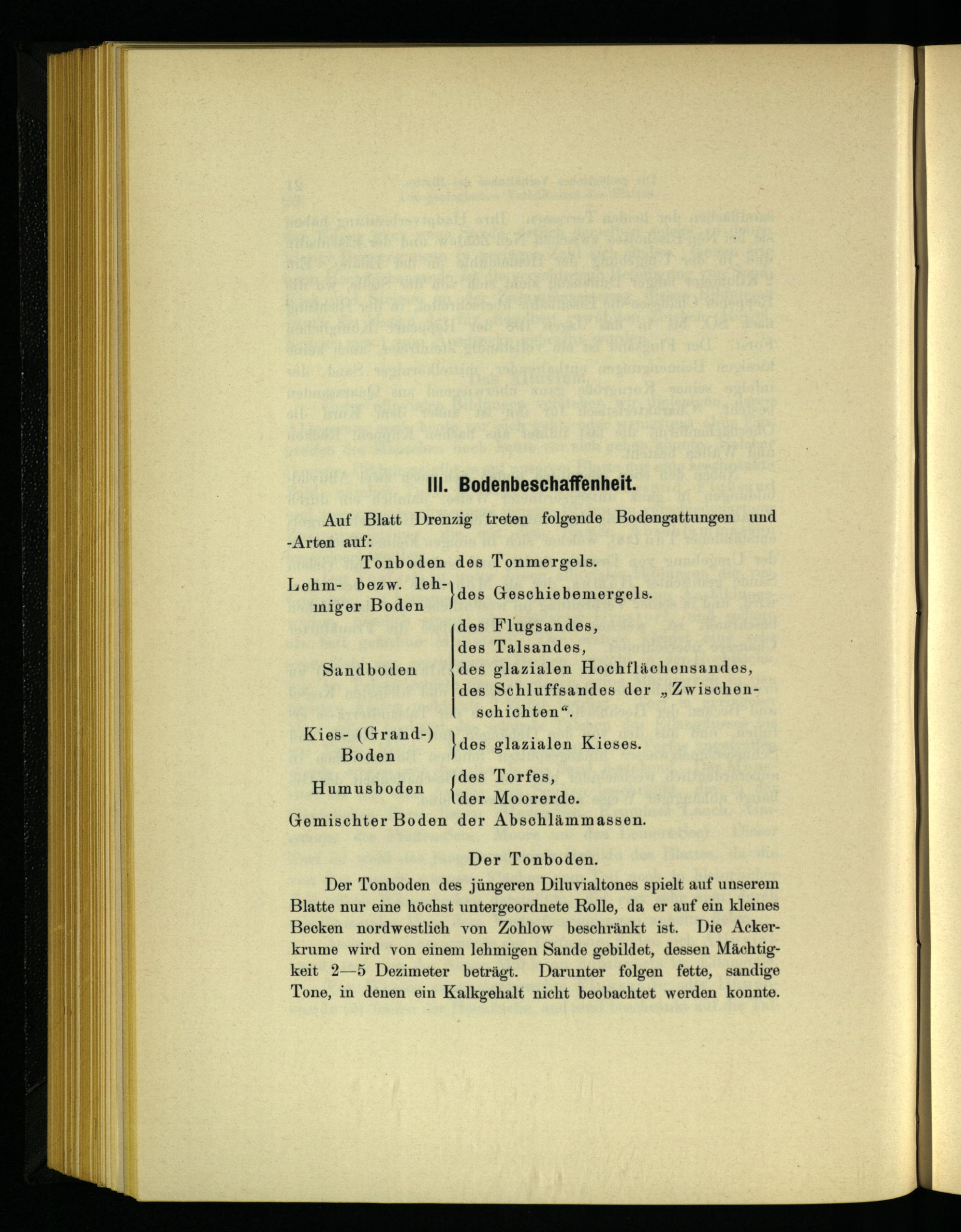 Der Tonboden des jüngeren Diluvialtones spielt auf unserem Blatte nur eine höchst untergeordnete Rolle, da er auf ein kleines Becken nordwestlich von Zohlow beschränkt ist. Die Ackerkrume wird von einem lehmigen Sande gebildet, dessen Mächtigkeit 2—5 Dezimeter beträgt. Darunter folgen fette, sandige Tone, in denen ein Kalkgehalt nicht beobachtet werden konnte.