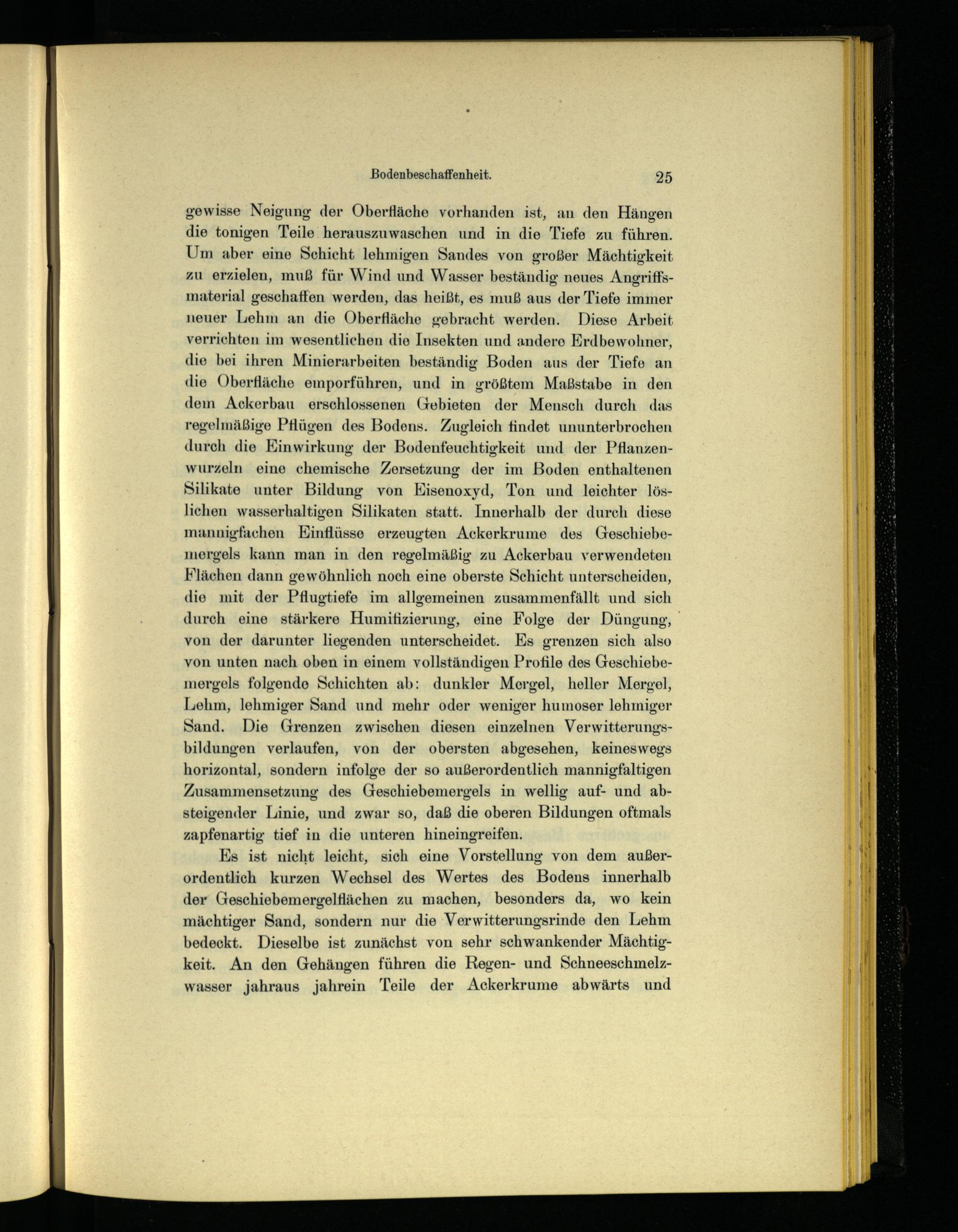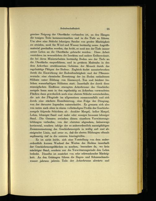 gewisse Neigung der Oberfläche vorhanden ist, an den Hängen die tonigen Teile herauszuwaschen und in die Tiefe zu führen. Um aber eine Schicht lehmigen Sandes von großer Mächtigkeit zu erzielen, muß für Wind und Wasser beständig neues Angriffsmaterial geschaffen werden, das heißt, es muß aus der Tiefe immer neuer Lehm an die Oberfläche gebracht werden. Diese Arbeit verrichten im wesentlichen die Insekten und andere Erdbewohner, die bei ihren Minierarbeiten beständig Boden aus der Tiefe an die Oberfläche emporführen, und in größtem Maßstabe in den dem Ackerbau erschlossenen Gebieten der Mensch durch das regelmäßige Pflügen des Bodens. Zugleich findet ununterbrochen durch die Einwirkung der Bodenfeuchtigkeit und der Pflanzenwurzeln eine chemische Zersetzung der im Boden enthaltenen Silikate unter Bildung von Eisenoxyd, Ton und leichter löslichen wasserhaltigen Silikaten statt. Innerhalb der durch diese mannigfachen Einflüsse erzeugten Ackerkrume des Geschiebemergels kann man in den regelmäßig zu Ackerbau verwendeten Flächen dann gewöhnlich noch eine oberste Schicht unterscheiden, die mit der Pflugtiefe im allgemeinen zusammenfällt und sich