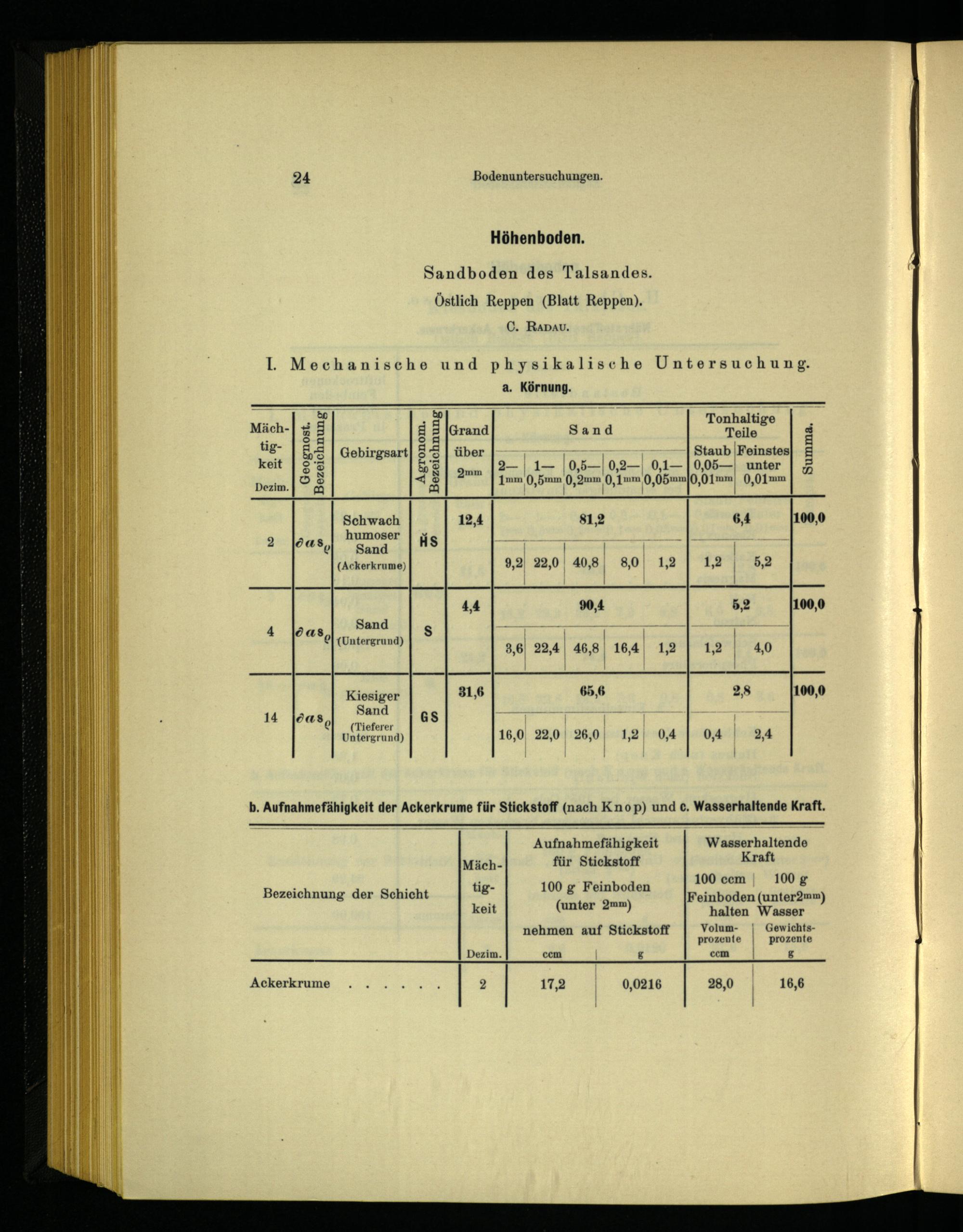 b. Aufnahmefähigkeit der Ackerkrume für Stickstoff(nach Knop) und c. Wasserhaltende Kraft,
