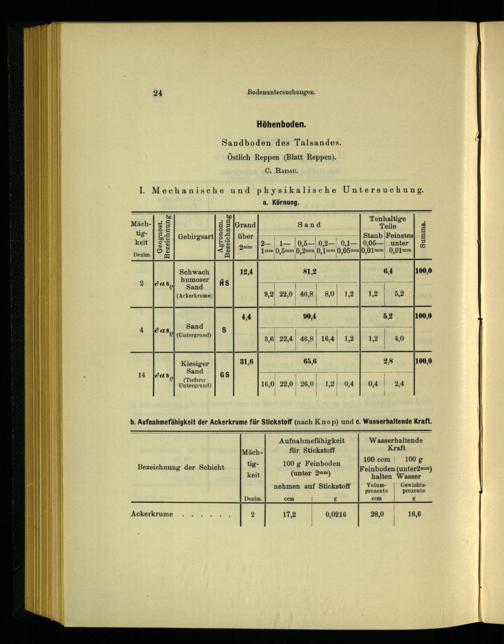a. Körnung. N F 0] nn. xx& Tonhaltige Mäch-|# 5 5 3 arand Sand Teile 5 HB- 58| Gebirgsart| 35| über 77 Staub /Feinstes|£ keit| 53 58| amm|2—| 1—|0,5—|0,2—| 0,1—|0,05—| unter| 5 Dezim. 95 3 1mm 0,5mm Q,2mm 0, 1mm 0,05m 0,0 1mm! 0,01mm Schwach 12,4 81,2 6,4 100,0 (Ackerkrume) 9,2 22,0| 40,8| 8,0| 1,2 1,2| 5,2 4,4 90,4 5,2 100,0 4 048 N eat) Ss.| ı|;||. b’ 8,6| 22,4| 46,8| 16,4| 1,2| 1,2| 40 Kiesiger 31,6 65,6 2,8 100,0 14 Joas, me Gs Untergrund) 16,0 22,0| 26,0| 1,2| 0,4 0,4 2,4