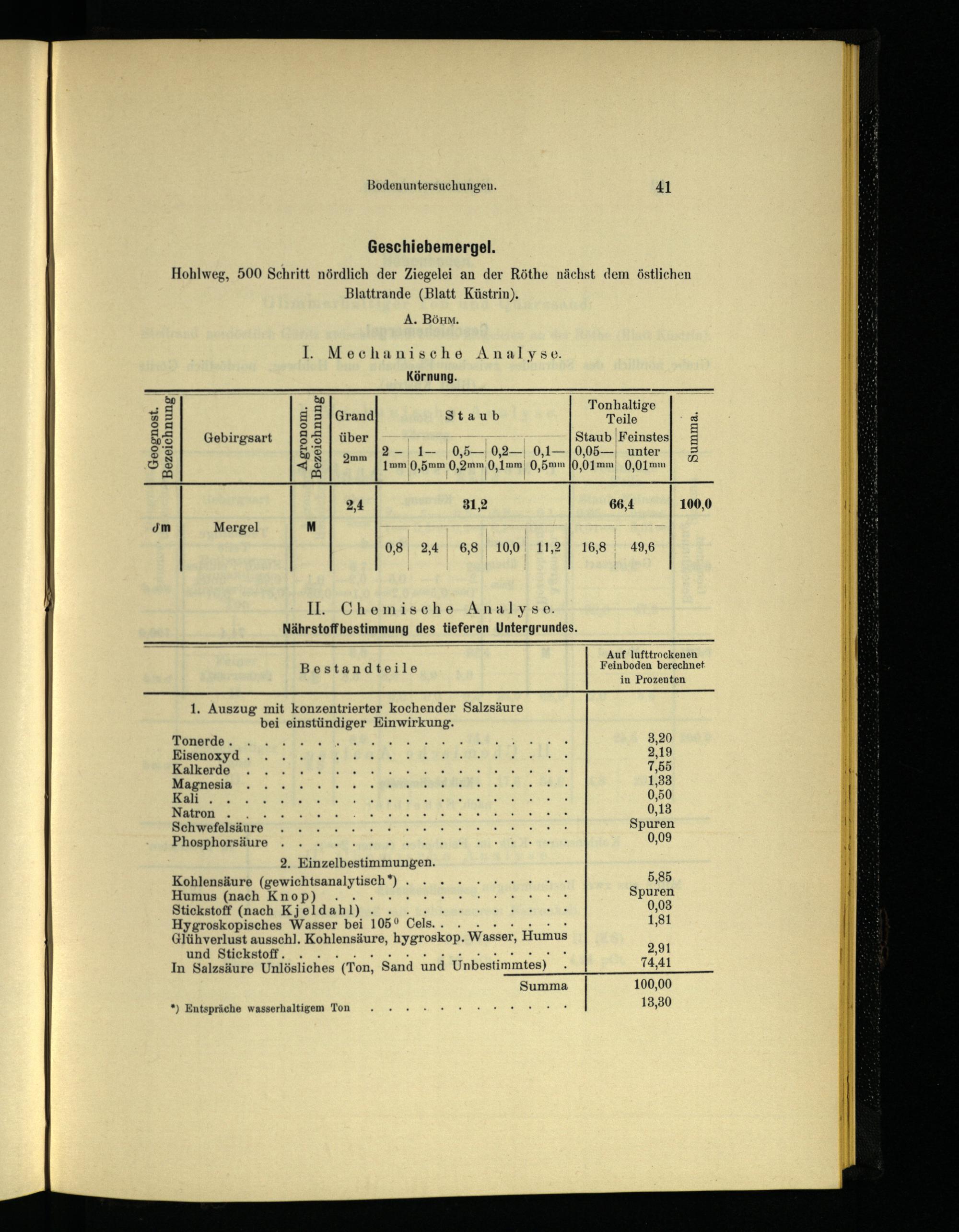 Kohlensäure(gewichtsanalytisch", 5,85 Humus(nach Knop). re a Spuren Stickstoff(nach Kjeldahl).. ee Kam 0,08 Hygroskopisches Wasser bei 1050 Cels... 1,81 Glühverlust ausschl. Kohlensäure, hygroskop. Wasser, Humus und Stickstoff...„2,91 In Salzsäure Unlösliches(Ton, Sand und Unbestimmtes).. 74,41 Summa 100,00 13,30